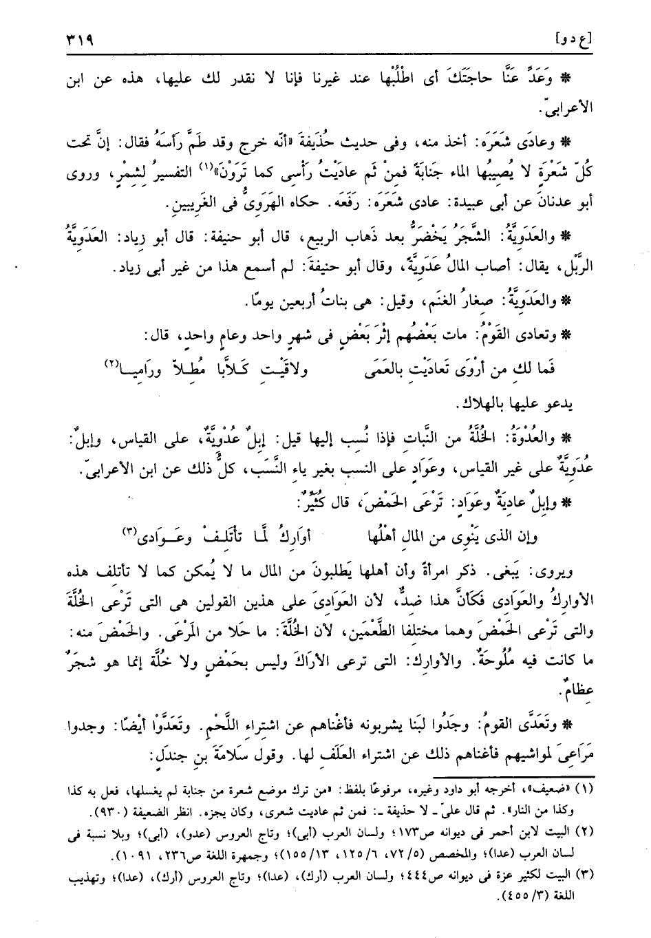 والعُدْوَةُ: الْخلَّة من النَّبَات فَإِذا نسب إِلَيْهَا قيل: إبل عُدْوِيَّةٌ، على الْقيَاس، وإبل عُدَوِيَّةٌ على غير الْقيَاس، وعَوَادٍ على النّسَب بِغَيْر يائي النّسَب، كل ذَلِك عَن ابْن الْأَعرَابِي.
