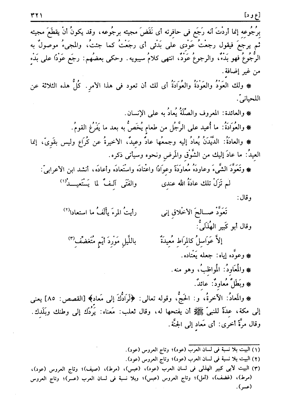 وَلَك العَوْدُ والعَوْدَةُ والعُوَادَةُ أَي لَك أَن تعود فِي هَذَا الْأَمر. كل هَذِه الثَّلَاثَة عَن اللحياني.