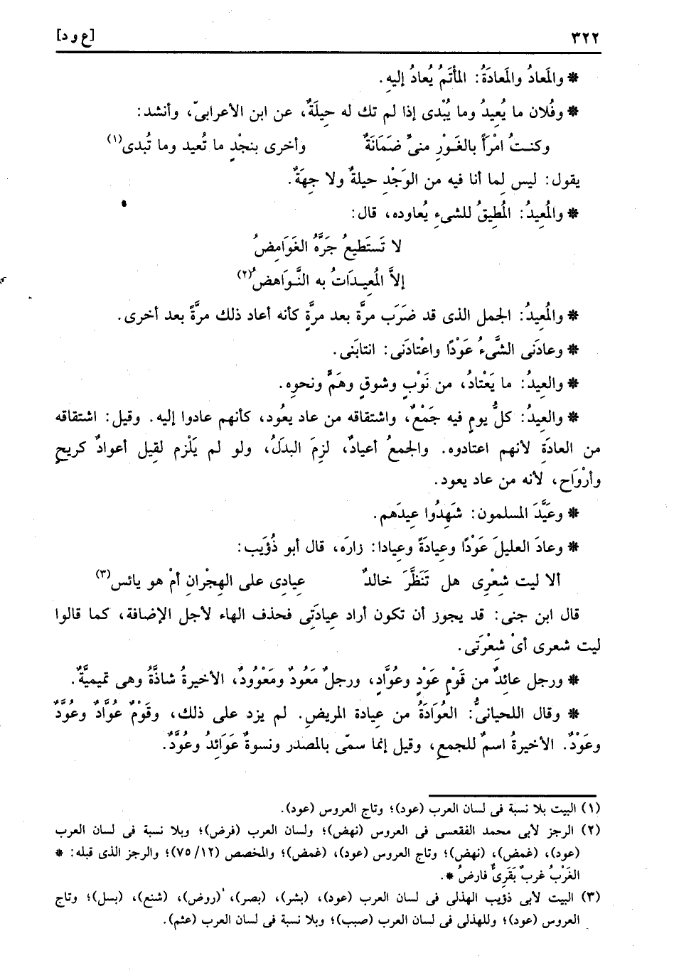 وَرجل عائِدٌ من قَوْمٍ عَوْد وعُوَّادٍ، وَرجل مَعُودٌ ومَعْوُودٌ، الْأَخِيرَة شَاذَّة وَهِي تميمية.