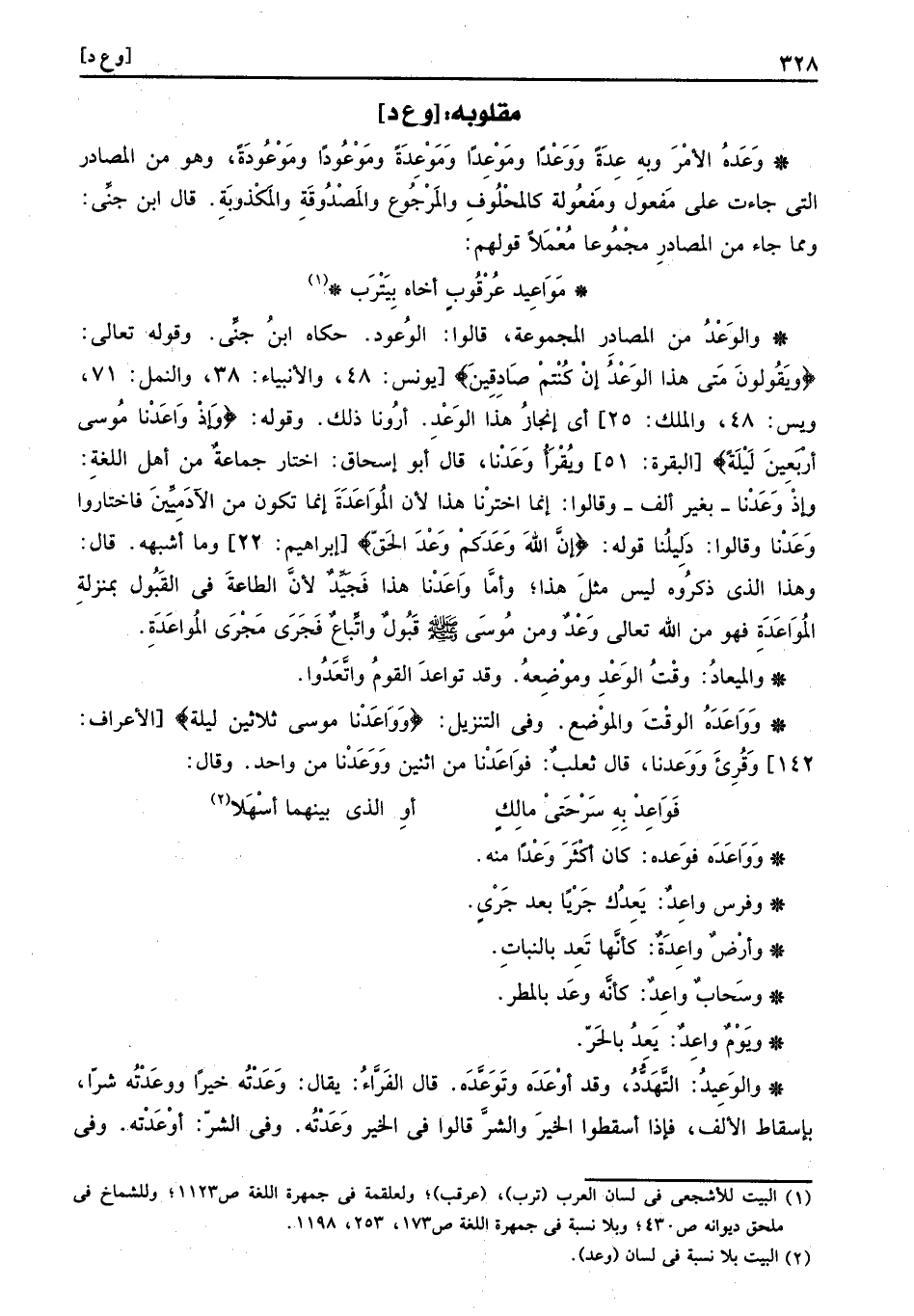 والوَعْدُ من المصادر الْمَجْمُوعَة قَالُوا: الوُعود. حَكَاهُ ابْن جني. وَقَوله تعال (ويَقُولونَ مَتى هَذَا الوَعْدُ إنْ كُنْتمْ صَادِقينَ) أَي إنجاز هَذَا الوَعْدِ أرونا ذَلِك. وَقَوله (وَإذْ وَاعَدْنا مُوسى أرْبَعِينَ لَيْلَةً) وَيقْرَأ وَعَدْنا، قَالَ أَبُو إِسْحَاق: اخْتَار جمَاعَة من أهل اللُّغَة: وَإِذ وَعَدنا - بِغَيْر ألف - وَقَالُوا: إِنَّمَا اخترنا هَذَا لِأَن المواعدة إِنَّمَا تكون من الْآدَمِيّين فَاخْتَارُوا وعدنا وَقَالُوا: دليلنا قَوْله (إنَّ اللهَ وَعَدَكمْ وَعْدَ الحَقّ) وَمَا أشبهه. قَالَ: وَهَذَا الَّذِي ذَكرُوهُ لَيْسَ مثل هَذَا، وَأما واعدنا هَذَا فجيد لِأَن الطَّاعَة فِي الْقبُول بِمَنْزِلَة المُوَاعَدَةِ فَهُوَ من الله تَعَالَى وَعْدٌ وَمن مُوسَى صَلَّى اللهُ عَلَيْهِ وَسَلَّمَ قبُول وَاتِّبَاع فَجرى مجْرى المُواعَدَةِ.