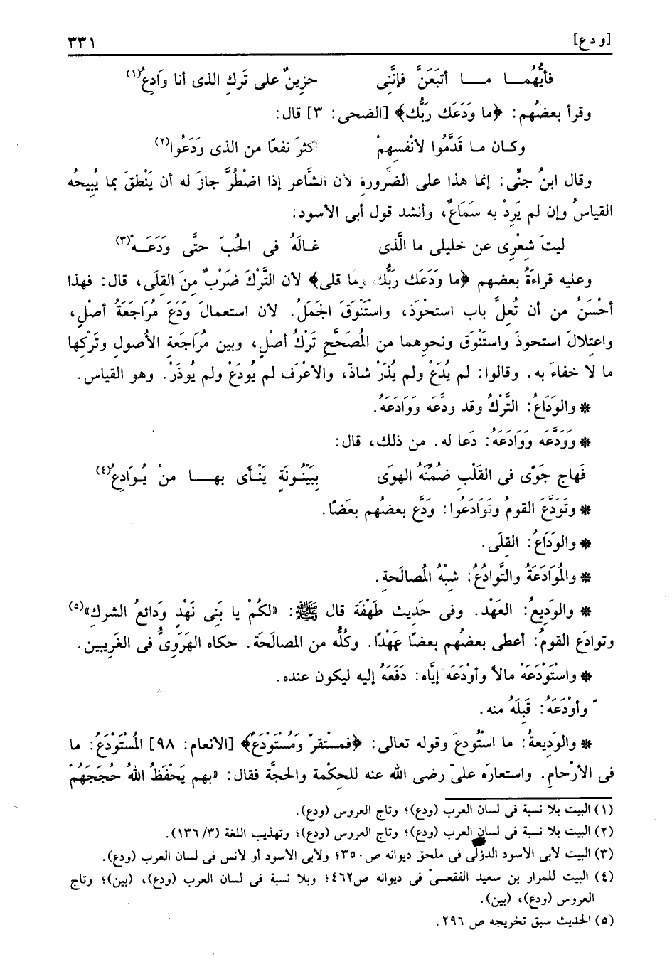 والوَدِيعةُ: مَا اسْتُودعَ وَقَوله تَعَالَى (فمسْتقرّ ومُسْتَودَعُ) المُسْتَوْدَعُ: مَا فِي الْأَرْحَام. واستعاره عَليّ رَضِي الله عَنهُ للحكمة وَالْحجّة فَقَالَ " بهم يَحْفَطُ الله حججهم