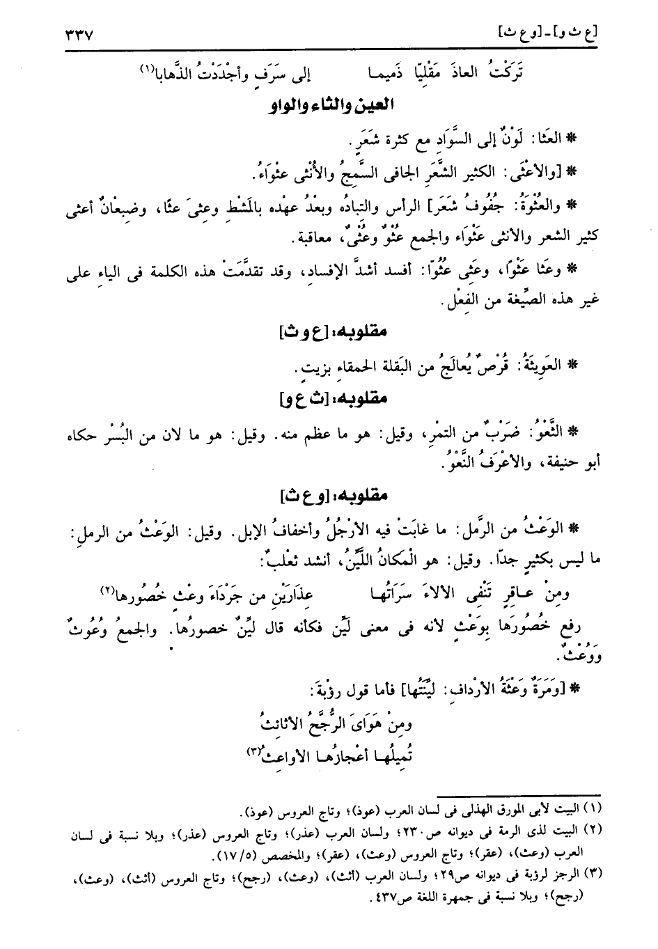 والعُثْوَةُ: جفوف شعر الرَّأْس والتباده وَبعد عَهده بالمشط وعِثىَ عثًا، وضبعان أعثى كثر الشّعْر وَالْأُنْثَى عَثْوَاء وَالْجمع عُثْوٌ وعُثْىٌ، معاقبة.