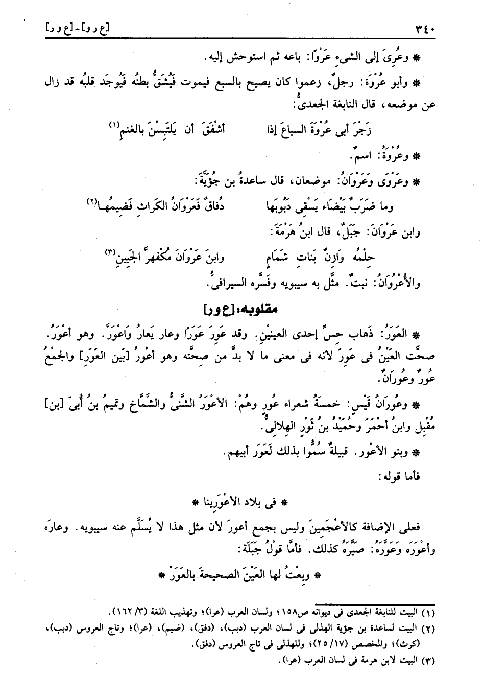 فعلى الْإِضَافَة كالأعجمين وَلَيْسَ بِجمع أَعور لِأَن مثل هَذَا لَا يسلم عَنهُ سِيبَوَيْهٍ. وعارَه وأعْوَرَه وعَوَّرَهُ: صيره كَذَلِك. فَأَما قَول جبلة: