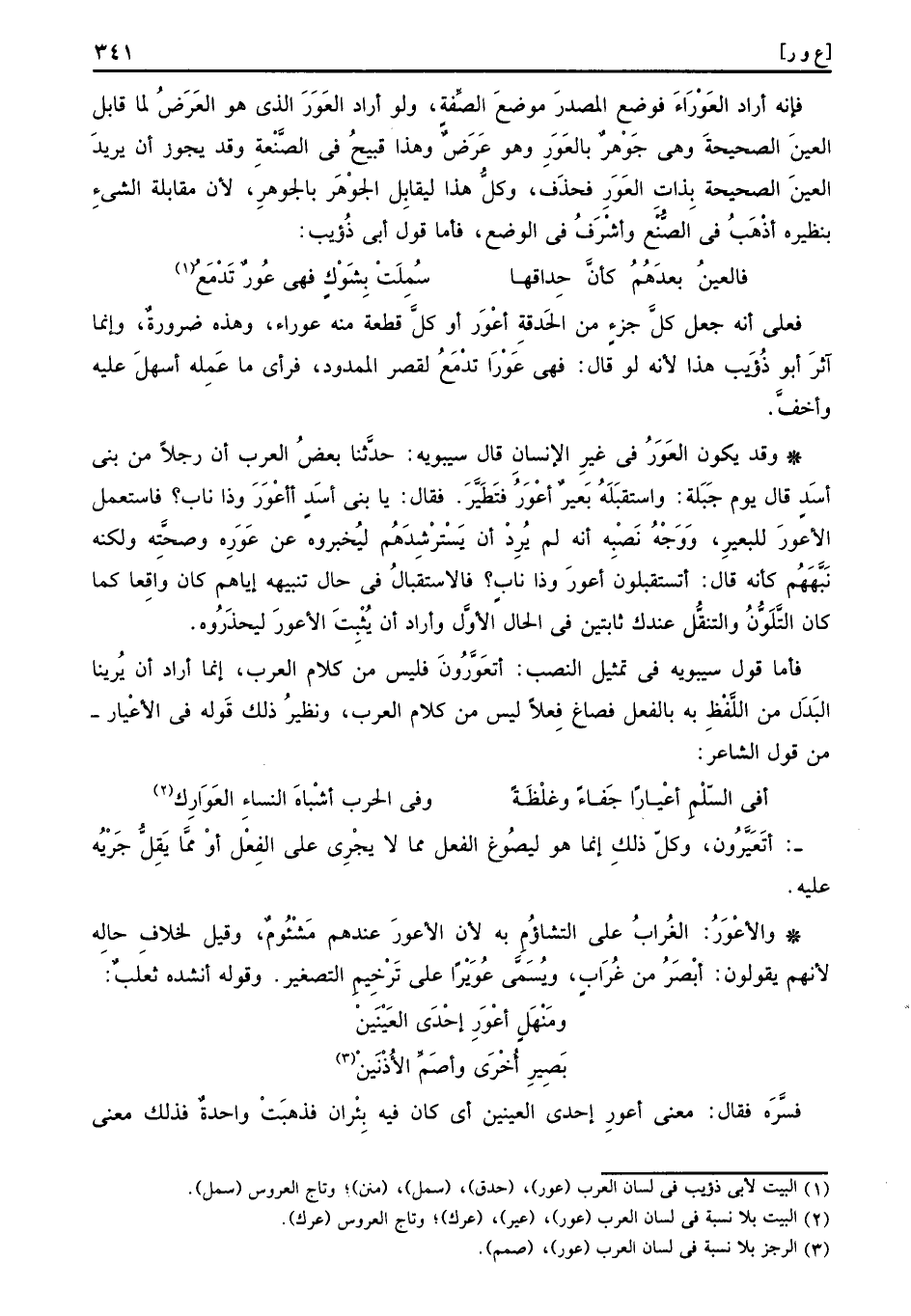 وَقد يكون العَوَرُ فِي غير الْإِنْسَان قَالَ سِيبَوَيْهٍ: حَدثنَا بعض الْعَرَب أَن رجلا من بني أَسد قَالَ يَوْم جبلة: واستقبله بعير أعْوَرُ فتطير. فَقَالَ: يَا بني أَسد أأعْوَرَ وَذَا نَاب؟ فَاسْتعْمل الأعورَ للبعير، وَوجه نَصبه انه لم يرد أَن يسترشدهم ليخبروه عَن عَوَرِه وَصِحَّته وَلكنه نبههم كَأَنَّهُ قَالَ: أتستقبلون أعورَ وَذَا نَاب؟ فالاستقبال فِي حَال تنبيهه إيَّاهُم كَانَ وَاقعا كَمَا كَانَ التلون والتنقل عنْدك ثابتين فِي الْحَال الأول وَأَرَادَ أَن يثبت الْأَعْوَر ليحذروه.