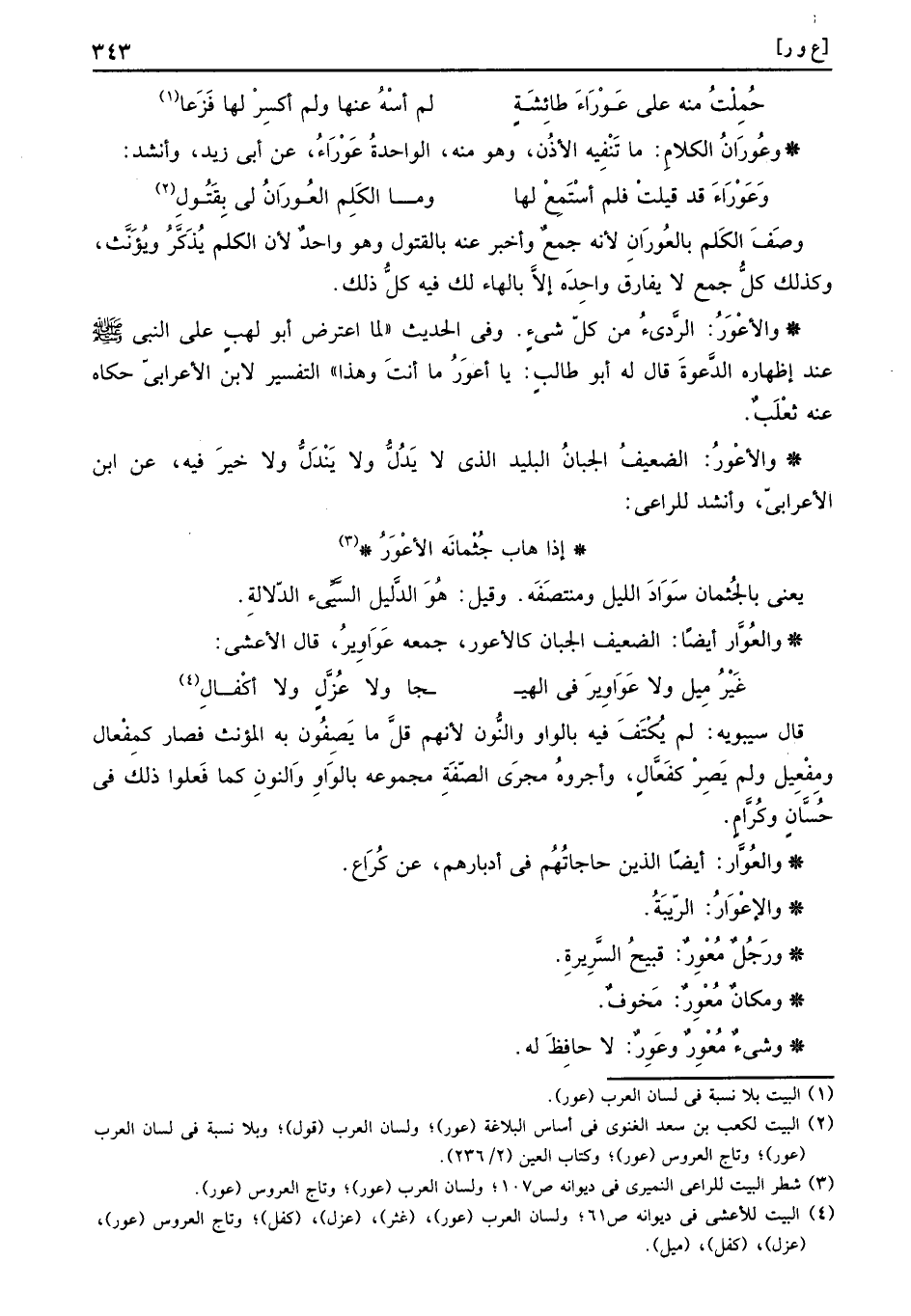 والعُوَّار أَيْضا: الضَّعِيف الجبان كالأعور، جمعه عَوَاوِيرُ، قَالَ الْأَعْشَى: