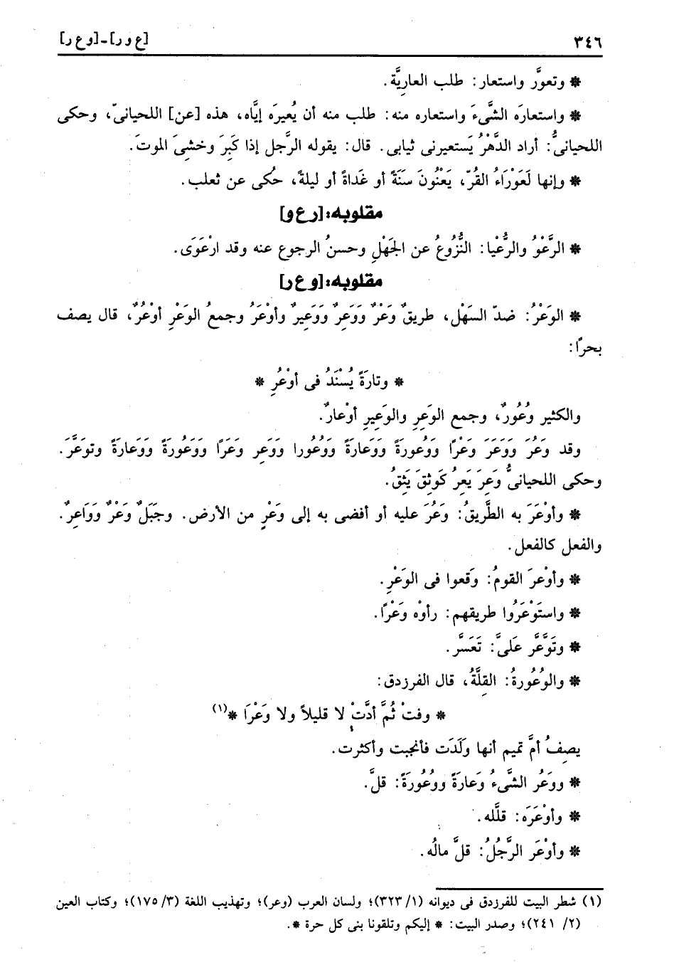 والوُعُورَةُ: الْقلَّة، قَالَ الفرزدق: