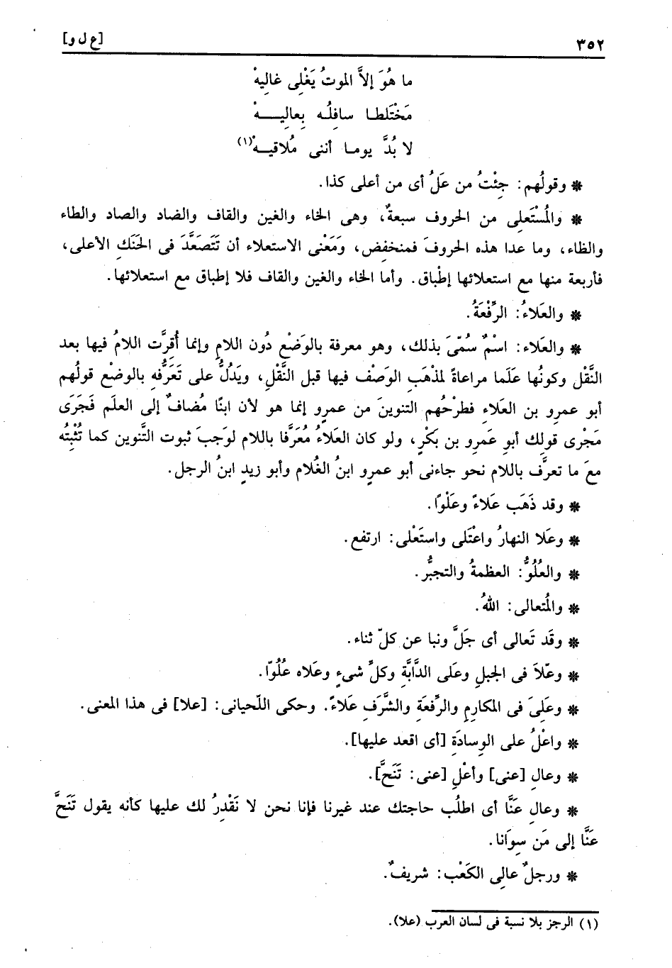 وعَلى فِي المكارم والرفعة والشرف عَلَاء. وَحكى اللحياني علا فِي هَذَا الْمَعْنى.