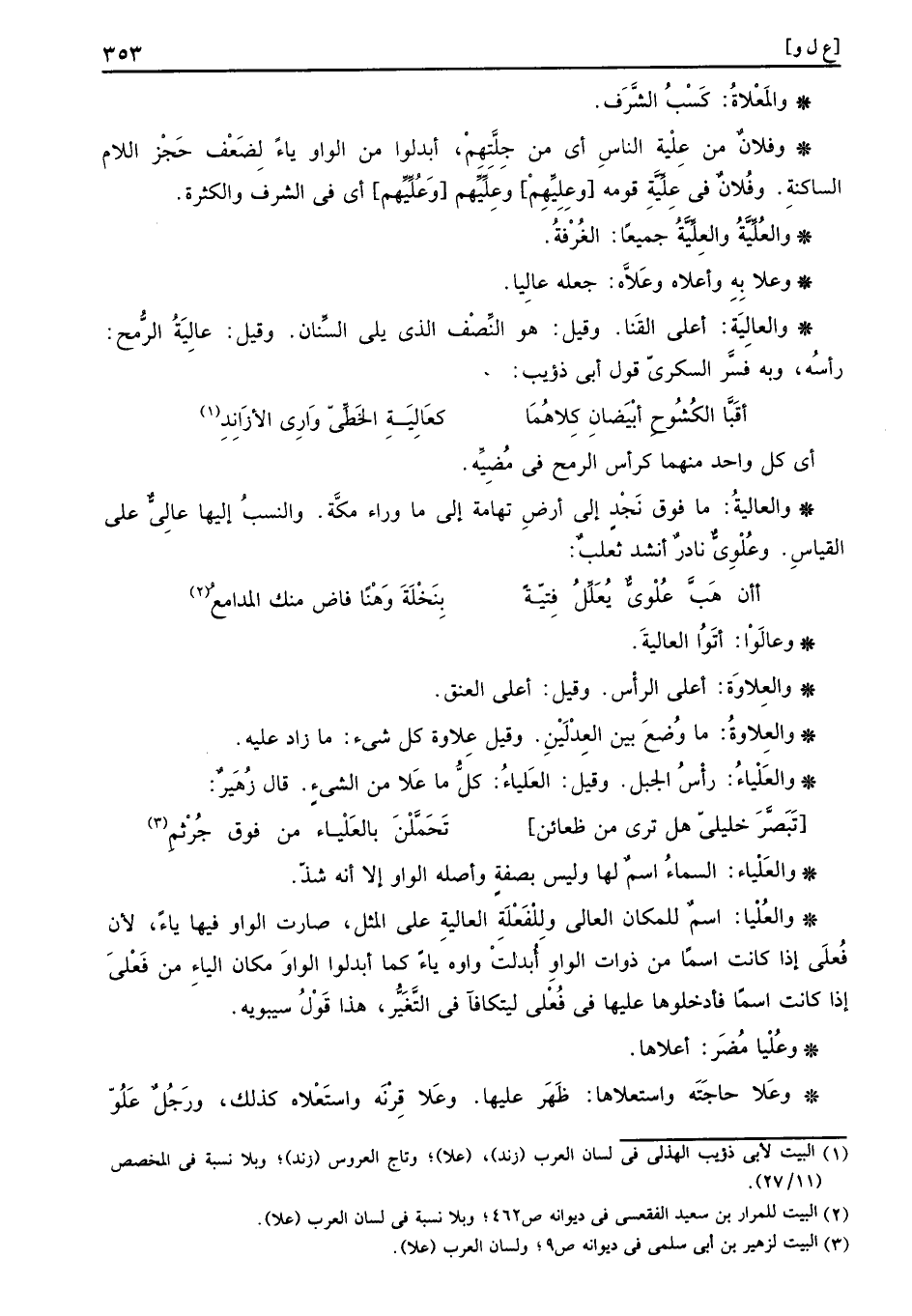 وَفُلَان من علية النَّاس أَي من جلتهم، ابدلوا من الْوَاو يَاء لضعف حجز اللَّام لساكنة. وَفُلَان فِي عَلَيْهِ قومه وَعَلَيْهِم وَعَلَيْهِم وَعَلَيْهِم أَي فِي الشّرف وَالْكَثْرَة.