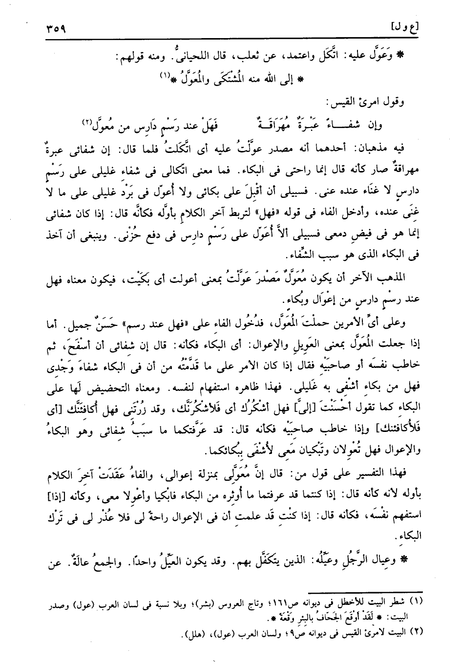 فِيهِ مذهبان: أَحدهمَا انه مصدر عولت عَلَيْهِ أَي اتكلت فَلَمَّا قَالَ: إِن شفائي عِبْرَة مهراقة صَار كَأَنَّهُ قَالَ إِنَّمَا راحتي فِي الْبكاء. فَمَا معنى اتكالي فِي شِفَاء غليلي على رسم دارس لاغناء عِنْده عني. فسبيلي أَن اقبل على بُكَائِي وَلَا اعول فِي برد غليلي على مَا لَا غنى عِنْده، وادخل الْفَاء فِي قَوْله " فَهَل " لتربط آخر الْكَلَام باوله فَكَأَنَّهُ قَالَ: إِذا كَانَ شفائي إِنَّمَا هُوَ فِي فيض دمعي فسبيلي أَلا اعول على رسم دارس فِي دفع حزني. وَيَنْبَغِي أَن اخذ فِي الْبكاء الَّذِي هُوَ سَبَب الشِّفَاء. الْمَذْهَب الآخر أَن يكون معول مصدر عولت بِمَعْنى اعولت أَي بَكَيْت، فَيكون مَعْنَاهُ فَهَل عِنْد رسم دارس من اعوال وبكاء.