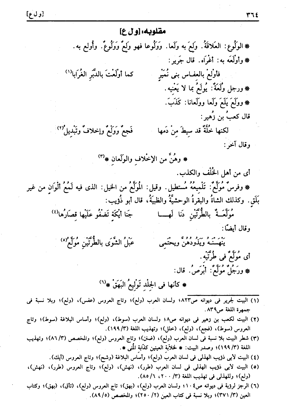 وَفرس مولع: تلميعه مستطيل. وَقيل: المولع من الْخَيل: الَّذِي فِيهِ لمع ألوان من غير بلق. وَكَذَلِكَ الشَّاة وَالْبَقَرَة الوحشية والظبية قَالَ أَبُو ذُؤَيْب: