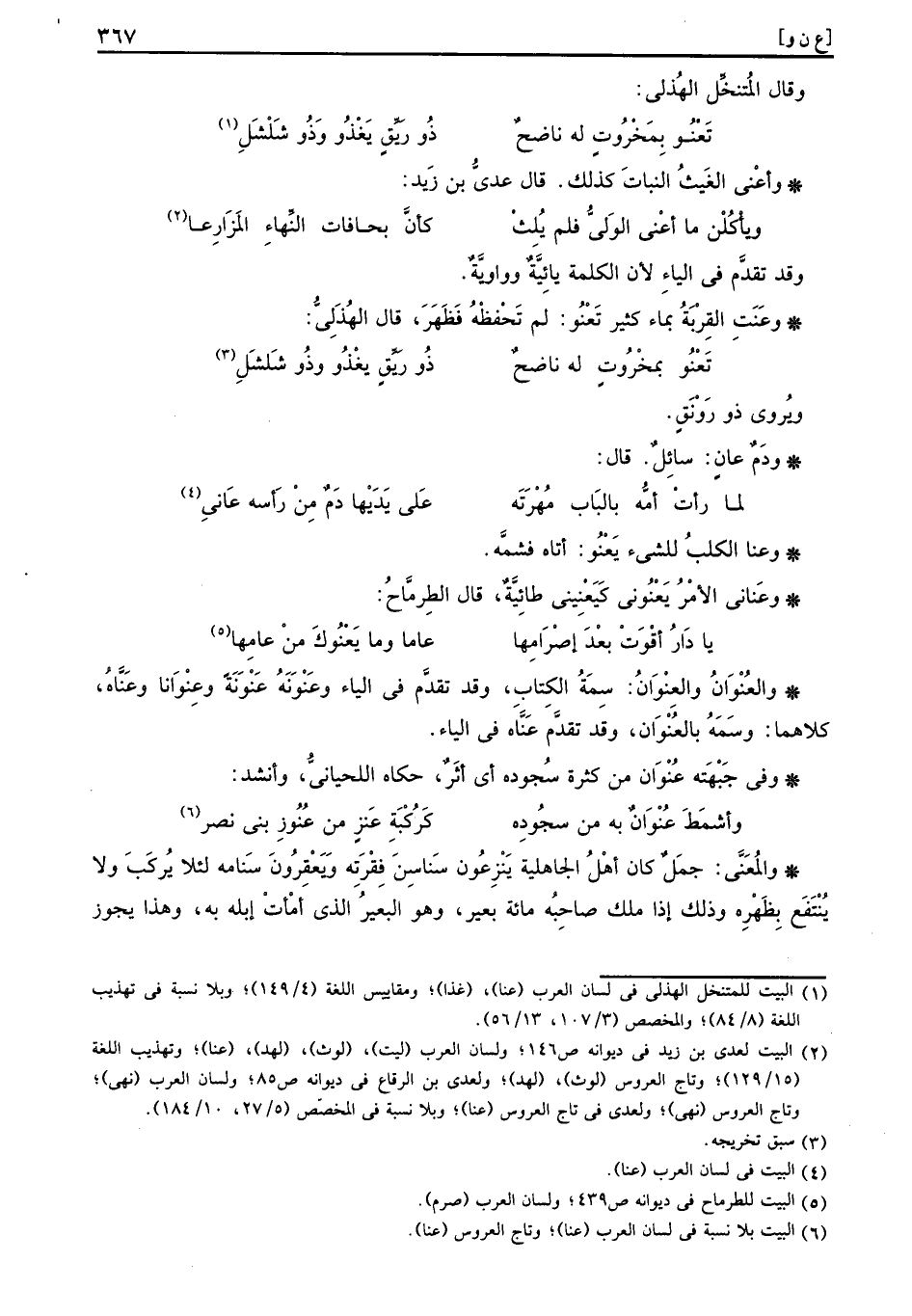 وعنت الْقرْبَة بِمَاء كثير تعنو: لم تحفظه فَظهر قَالَ الْهُذلِيّ: