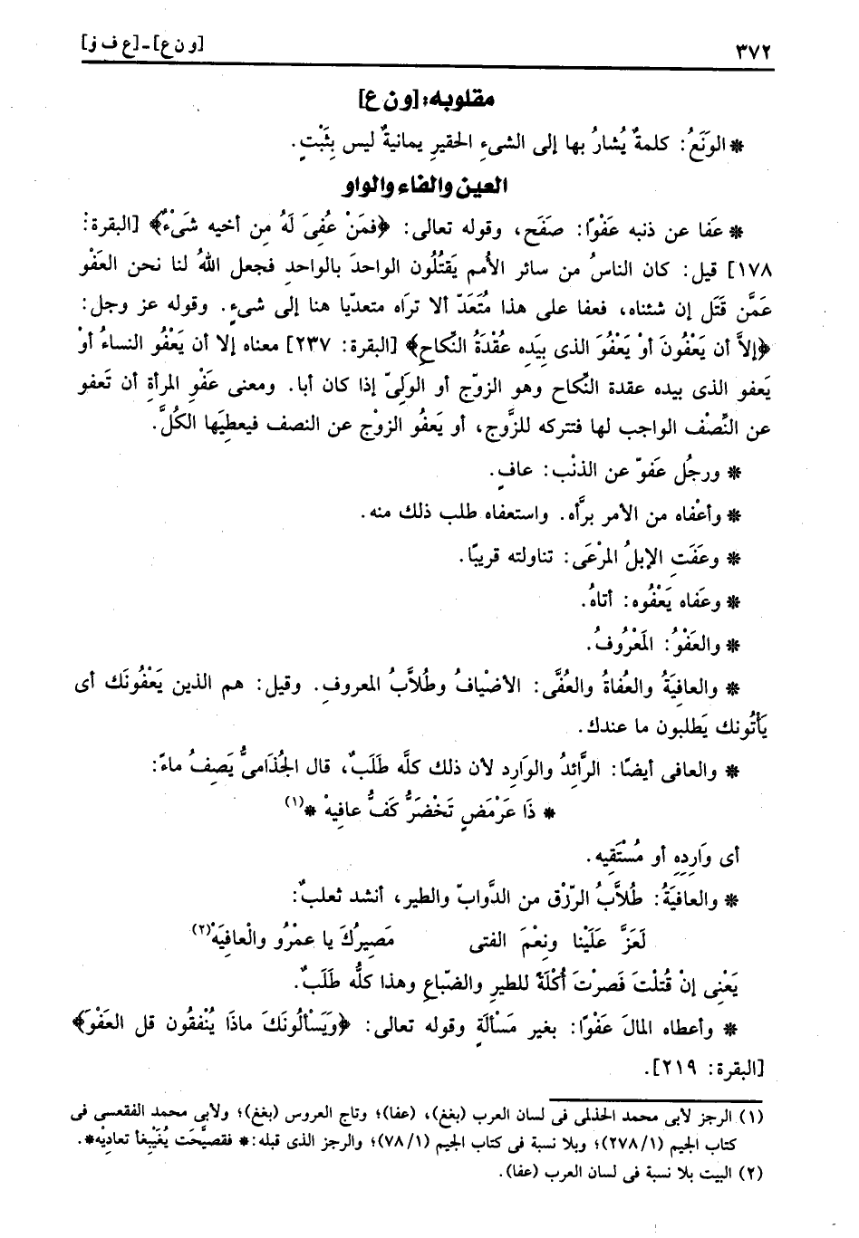 عَفا عَن ذَنبه عفوا: صفح، وَقَوله تَعَالَى (فَمن عُفيَ لَهُ من اخيه شَيْء) قيل: كَانَ النَّاس من سَائِر الْأُمَم يقتلُون الْوَاحِد بِالْوَاحِدِ فَجعل الله لنا الْعَفو عَمَّن قتل إت شئناه، فَعَفَا على هَذَا مُتَعَدٍّ أَلا ترَاهُ مُتَعَدِّيا هُنَا إِلَى شَيْء وَقَوله عز وَجل (إِلَّا أَن يعفون أَو يعْفُو الَّذِي بِيَدِهِ عقدَة النِّكَاح) مَعْنَاهُ إِلَّا أَن يعْفُو النسء أَو يعْفُو الَّذِي بِيَدِهِ عقدَة النِّكَاح وَهُوَ الزَّوْج أَو الْوَلِيّ إِذا كَانَ ابا. وَمعنى عَفْو الْمَرْأَة أَن تَعْفُو عَن النّصْف الْوَاجِب لَهَا فتتركه للزَّوْج، أَو يعْفُو الزَّوْج عَن النّصْف فيعطيها الْكل.