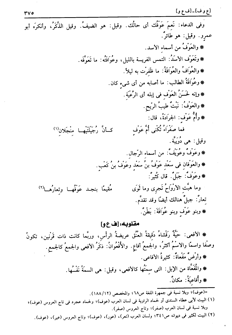 وَفِي الدُّعَاء: نعم عوفك أَي حالك. وَقيل: هُوَ الضَّيْف. وَقيل الذّكر، وانكره أَبُو عَمْرو. وَقيل: هُوَ طَائِر.