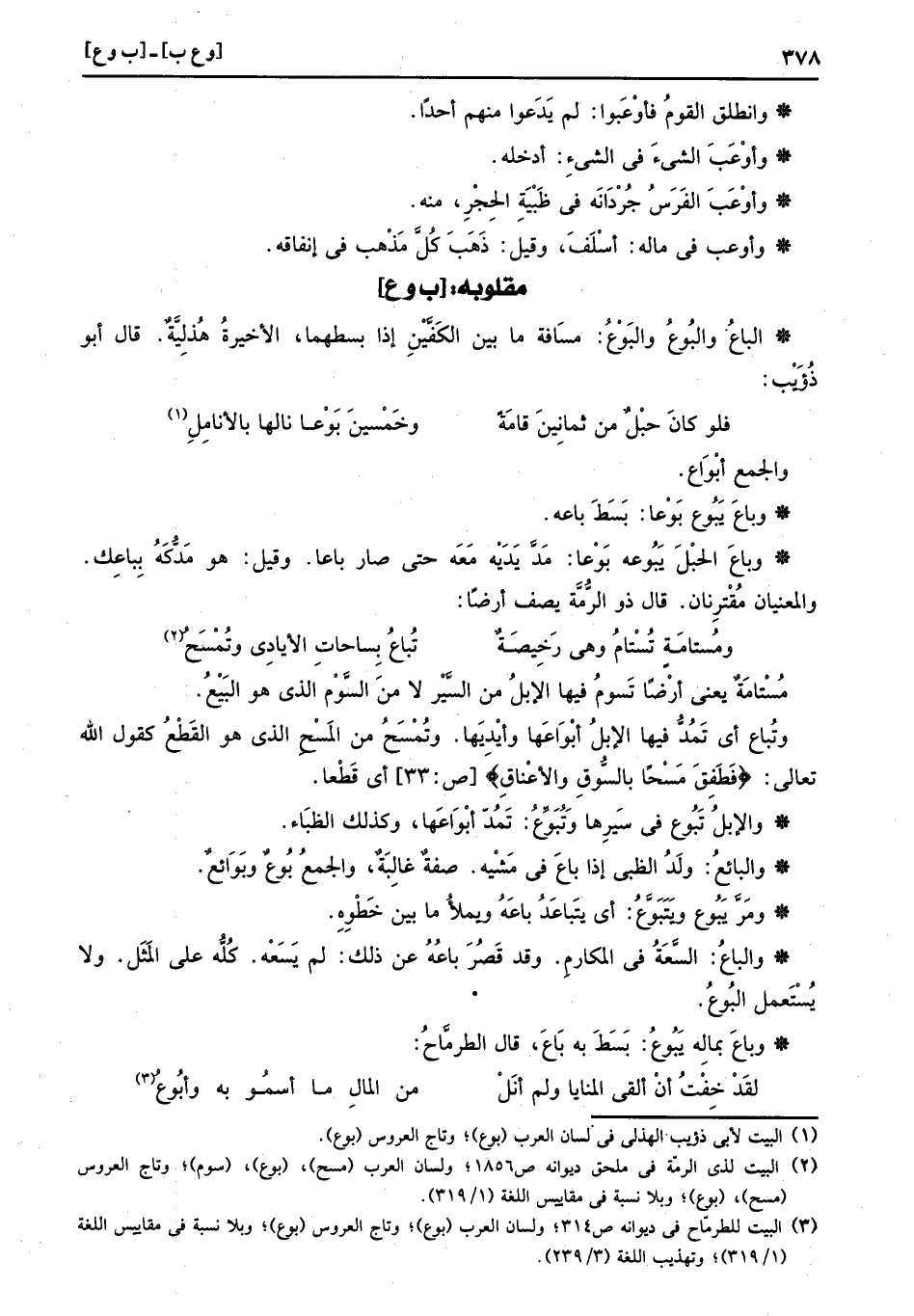 الباع والبوع والبوع: مَسَافَة مَا بَين الْكَفَّيْنِ إِذا بسطهما، الْأَخِيرَة هذلية. قَالَ أَبُو ذُؤَيْب: