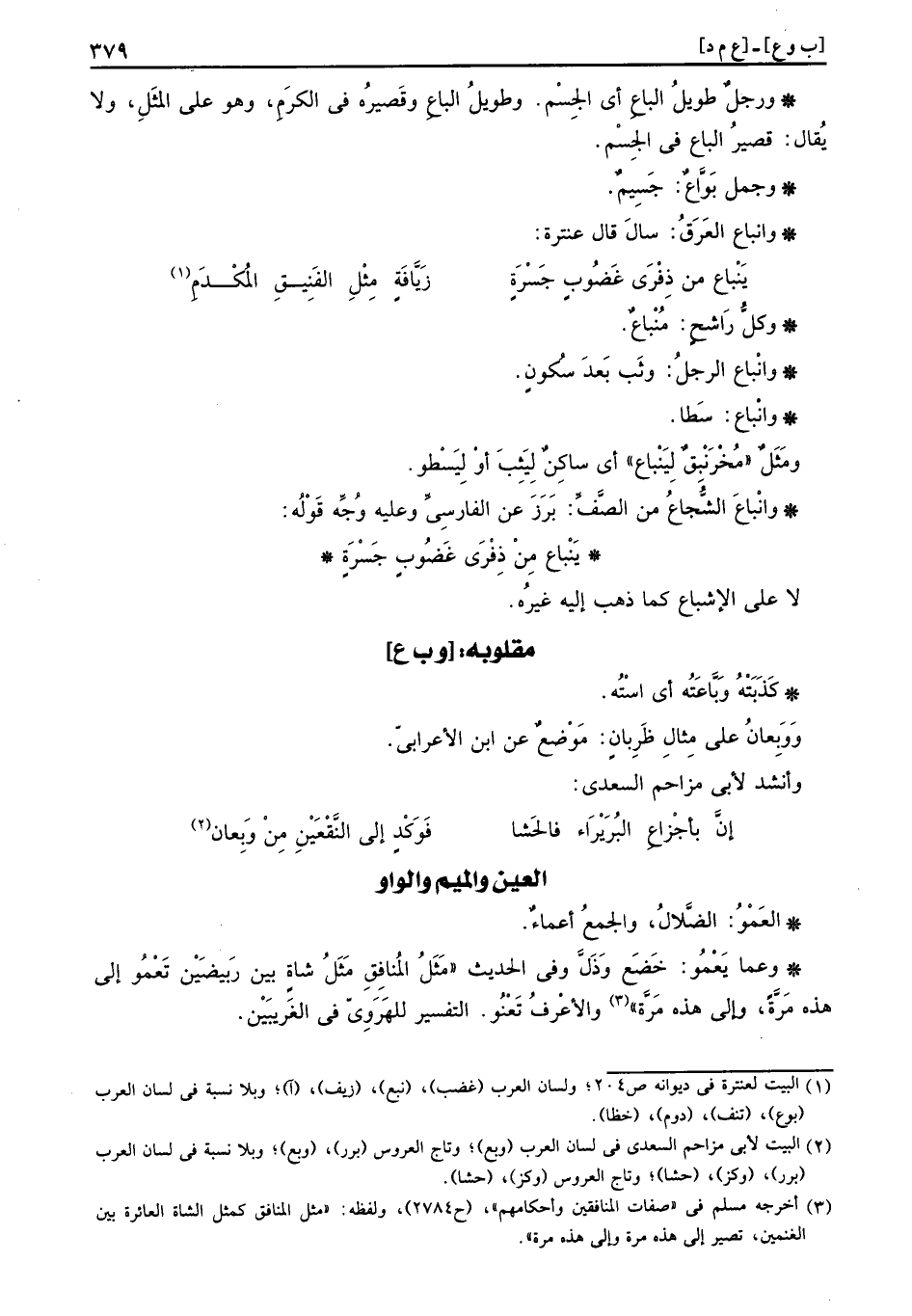 وَعَما يعمو: خضع وذل وَفِي الحَدِيث " مثل الْمُنَافِق مثل شَاة بَين ربيضين تعمو إِلَى هَذِه مرّة وَإِلَى هَذِه مرّة " والاعرف تعنو. التَّفْسِير للهروي فِي الغريبين.
