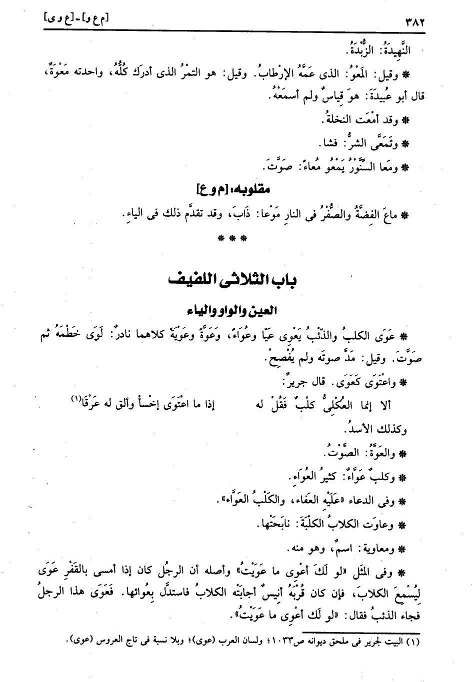 وَفِي الدُّعَاء " عَلَيْهِ العفاء، وَالْكَلب العواء " ز عاوت الْكلاب الكلبة: نابحتها.