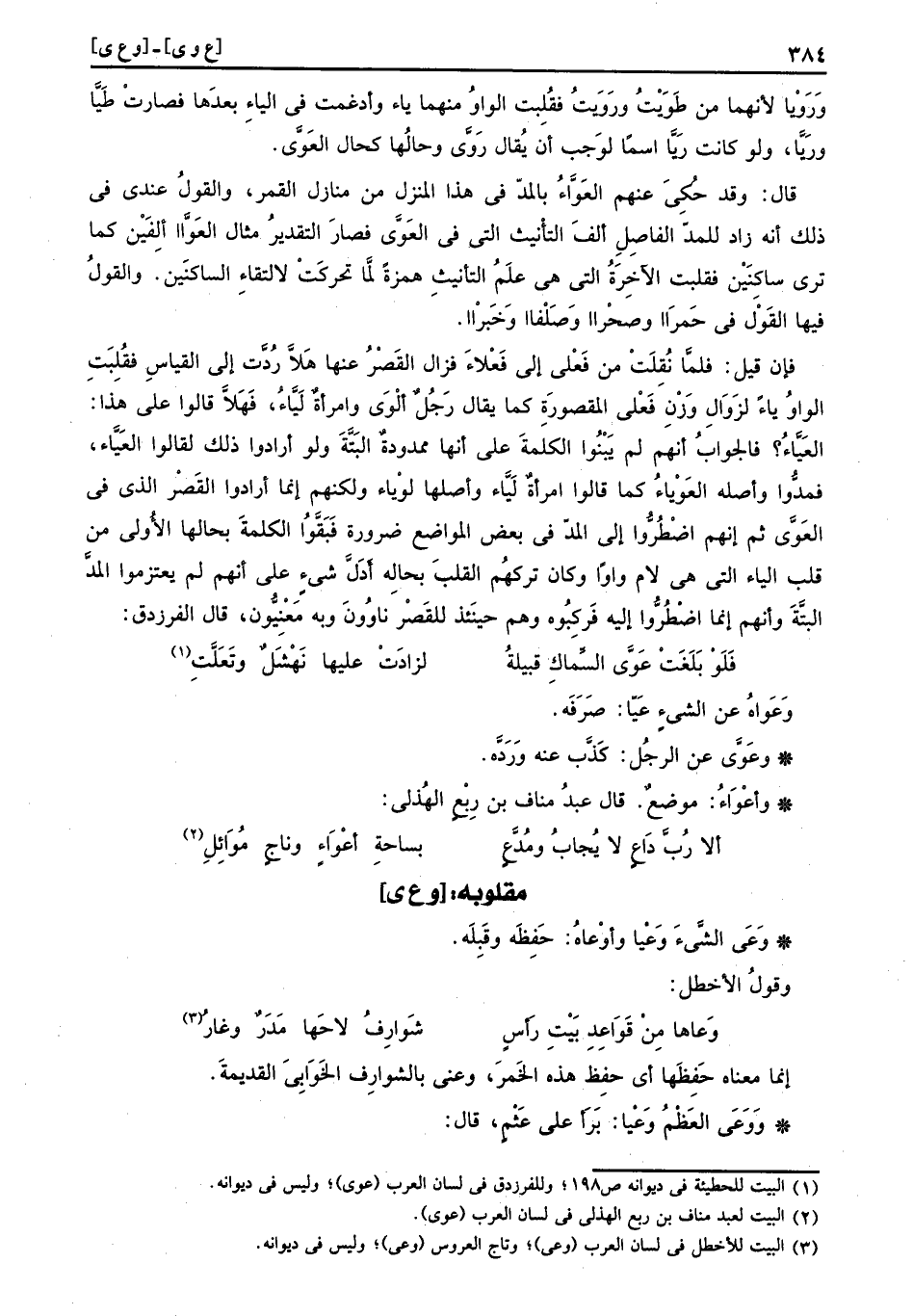 ورويا لانهما من طويت وَرويت فقلبت الْوَاو مِنْهُمَا يَاء وادغمت فِي الْيَاء بعْدهَا فَصَارَت طيا وريا، وَلَو كَانَت ريا اسْما لوَجَبَ أَن يُقَال روى وحالها كَحال العوى. قَالَ: وَقد حكى عَنْهُم العواء بِالْمدِّ فِي هَذَا الْمنزل من منَازِل الْقَمَر، وَالْقَوْل عِنْدِي فِي ذَلِك انه زَاد للمد الْفَاصِل ألف التانيث الَّتِي فِي العوى فَصَارَ التَّقْدِير مِثَال العواا الفين كَمَا ترى ساكنين فقلبت الْآخِرَة الَّتِي هِيَ علم التانيث همزَة لما تحركت لالتقاء الساكنين. وَالْقَوْل فِيهَا القَوْل فِي حمراا وصحراا وصلفاا وخبراا.