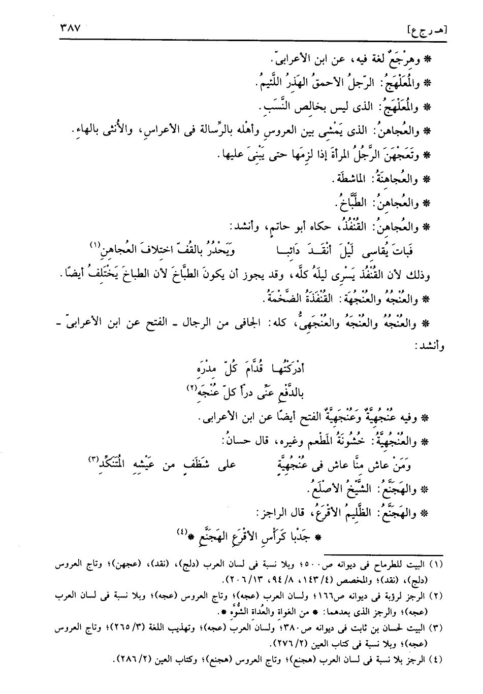 والعجاهن: الْقُنْفُذ، حَكَاهُ أَبُو حَاتِم وانشد: