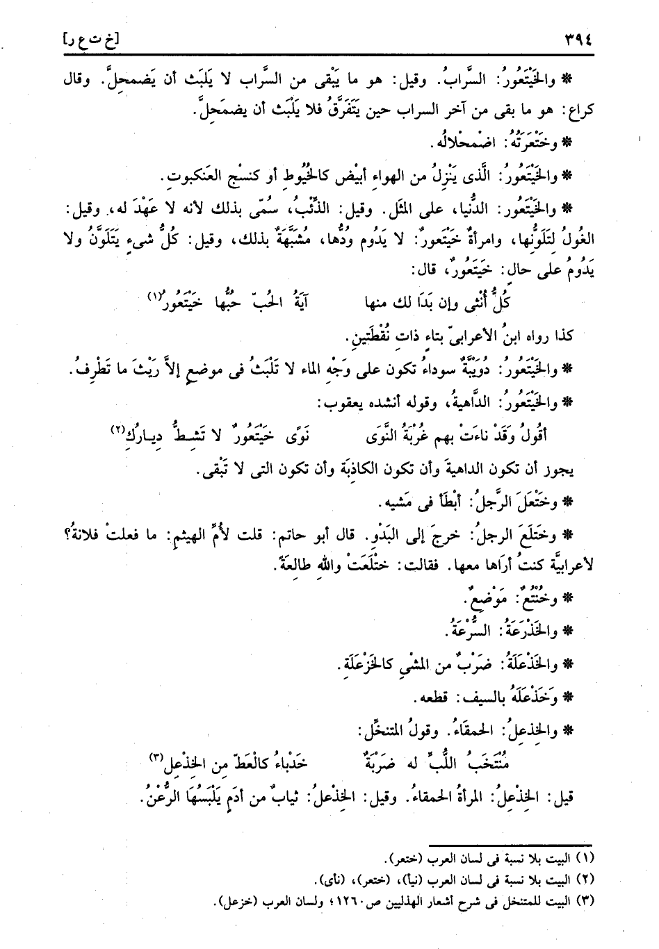 وختلع الرجل: خرج إِلَى البدو. قَالَ أَبُو حَاتِم: قلت لأم الْهَيْثَم: مَا فعلت فُلَانَة؟ لأعرابية كنت اراها مَعهَا. فَقَالَت: ختلعت وَالله طالعة.