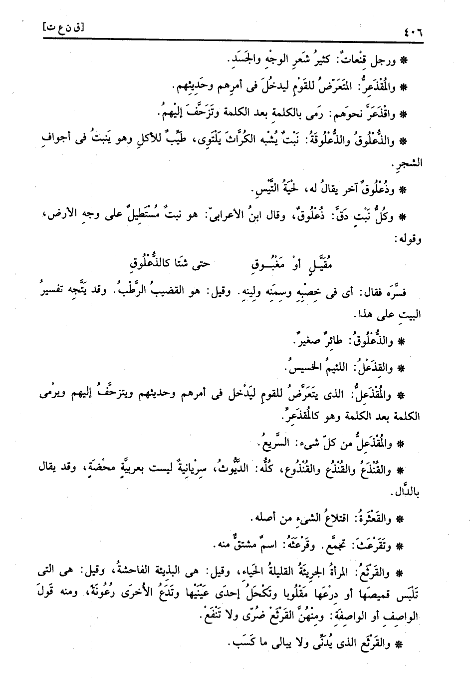 والمقذعل: الَّذِي يتَعَرَّض للْقَوْم ليدْخل فِي امرهم وحديثهم ويتزحف اليهم وَيَرْمِي الْكَلِمَة بعد الْكَلِمَة وَهُوَ كالمقذعر.