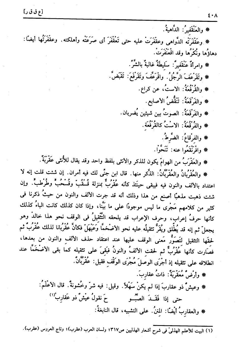 والعقربان والعقربان: الذّكر مِنْهَا. قَالَ ابْن جني لَك فِيهِ امران. إِن شِئْت قلت إِنَّه لَا اعْتِدَاد بالالف وَالنُّون فِيهِ فَيبقى حِينَئِذٍ كَأَنَّهُ عقرب بِمَنْزِلَة قسقب وقسحب وطرطب، وَإِن شِئْت ذهبت مذهبا اصْنَع من هَذَا وَذَلِكَ انه قد جرت الْألف وَالنُّون من حَيْثُ ذكرنَا فِي كثير من كَلَامهم مجْرى مَا لَيْسَ مَوْجُودا على مَا بَيْننَا، وَإِذا كَانَ كَذَلِك كَانَت الْبَاء كَذَلِك كَأَنَّهَا حرف إِعْرَاب، وحرف الْإِعْرَاب قد يلْحقهُ التثقيل فِي الْوَقْف نَحْو هَذَا خَالِد وَهُوَ يَجْعَل ثمَّ إِنَّه قد يُطلق ويقر تثقيله عَلَيْهِ نَحْو الأضخما وعيهل فَكَأَن عقربانا لذَلِك عقرب ثمَّ لحقها التثقيل لتصور معنى الْوَقْف عَلَيْهَا عِنْد اعْتِقَاد حذف الْألف وَالنُّون من بعْدهَا، فَصَارَت كَأَنَّهَا عقرب ثمَّ لحقت الْألف وَالنُّون فبقى على تثقيله كَمَا بقى الأضخما عِنْد انطلاقه على تثقيله إِذْ أجْرى الْوَصْل مجْرى الْوَقْف فَقيل: عقربان.