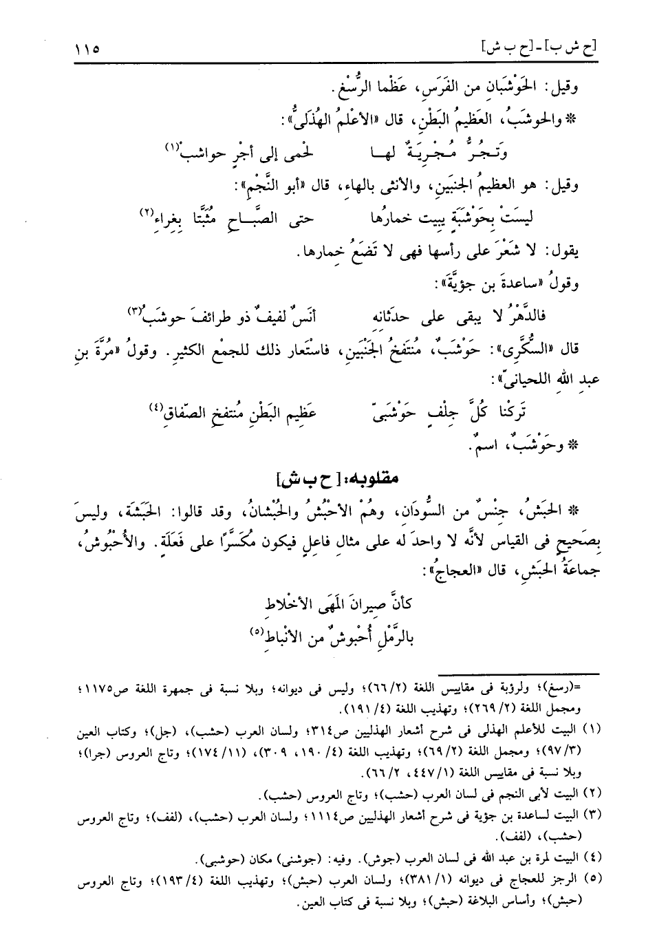 الحبَشُ: جنس من السودَان، وهم الأحْبُشُ والحُبْشانُ، وَقد قَالُوا الحَبَشة، وَلَيْسَ بِصَحِيح فِي الْقيَاس لِأَنَّهُ لَا وَاحِد لَهُ على على مِثَال فَاعل فَيكون مكسرا على فَعَلَة. والأُحْبُوشُ، جمَاعَة الحبَشِ، قَالَ العجاج: