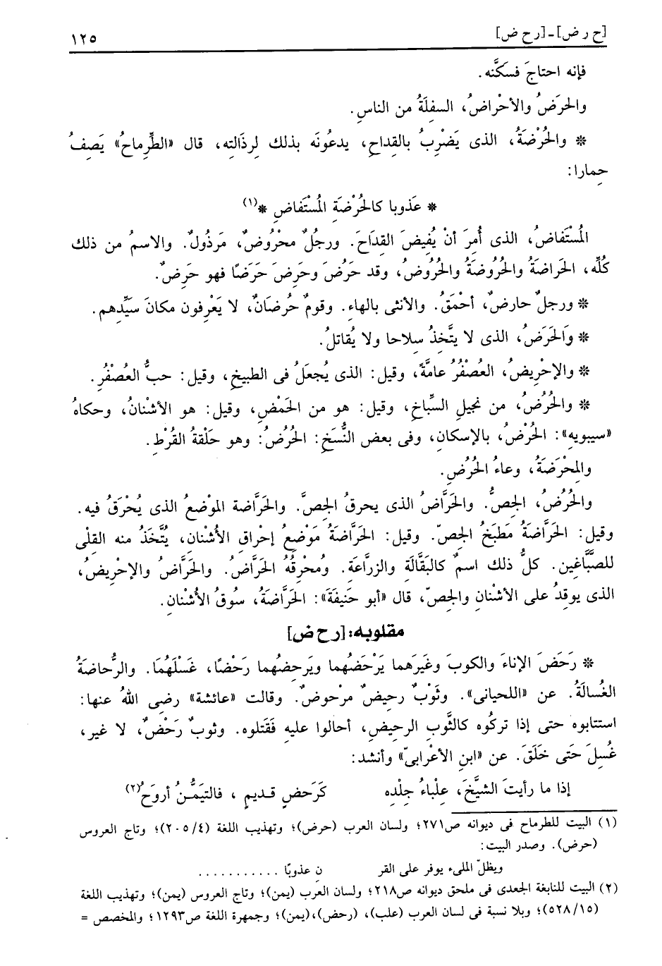 والحُرُضُ: الجص. والحَرَّاضُ الَّذِي يحرق الجص. والحَرَّاضَة الْموضع الَّذِي يحرق فِيهِ. وَقيل: الحَرَّاضَةُ مطبخ الجص. وَقيل: الحَرَّاضَةُ مَوضِع إحراق الأشنان، يتَّخذ من القلي للصباغين. كل ذَلِك اسْم كالبقالة والزراعة. ومحرقة الحَرَّاضُ. والحَرَّاضُ والإحْرِيضُ، الَّذِي يُوقد على الأشنان والجص، قَالَ أَبُو حنيفَة: الحَرَّاضَةُ، سوق الأشنان.