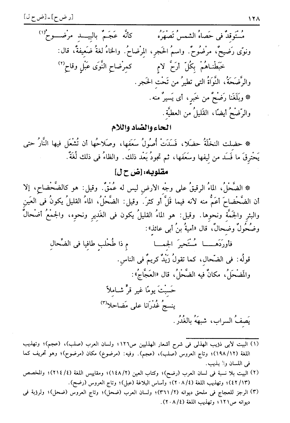 والمَضْحَلُ: مَكَان فِيهِ الضَّحْلُ، قَالَ العجاج: