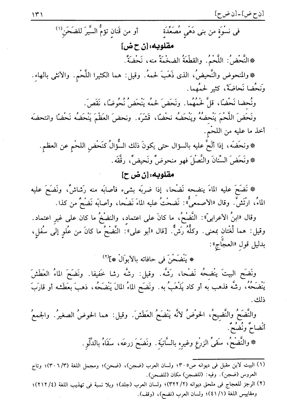 والمنحوض والنَّحيضُ، الَّذِي ذهب لَحْمه. وَقيل: هما الكثيرا اللَّحْم. وَالْأُنْثَى بِالْهَاءِ. ونَحُضا نَحاضَةٍ، كثر لحمهما.