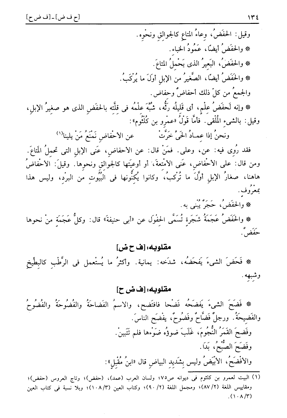 وانه لحَفَضُ علم، أَي قَلِيله رثه، شبه علمه فِي قلته بالحفَضِ الَّذِي هُوَ صَغِير الْإِبِل، وَقيل: بالشَّيْء الْملقى. فَأَما قَول عَمْرو بن كُلْثُوم: