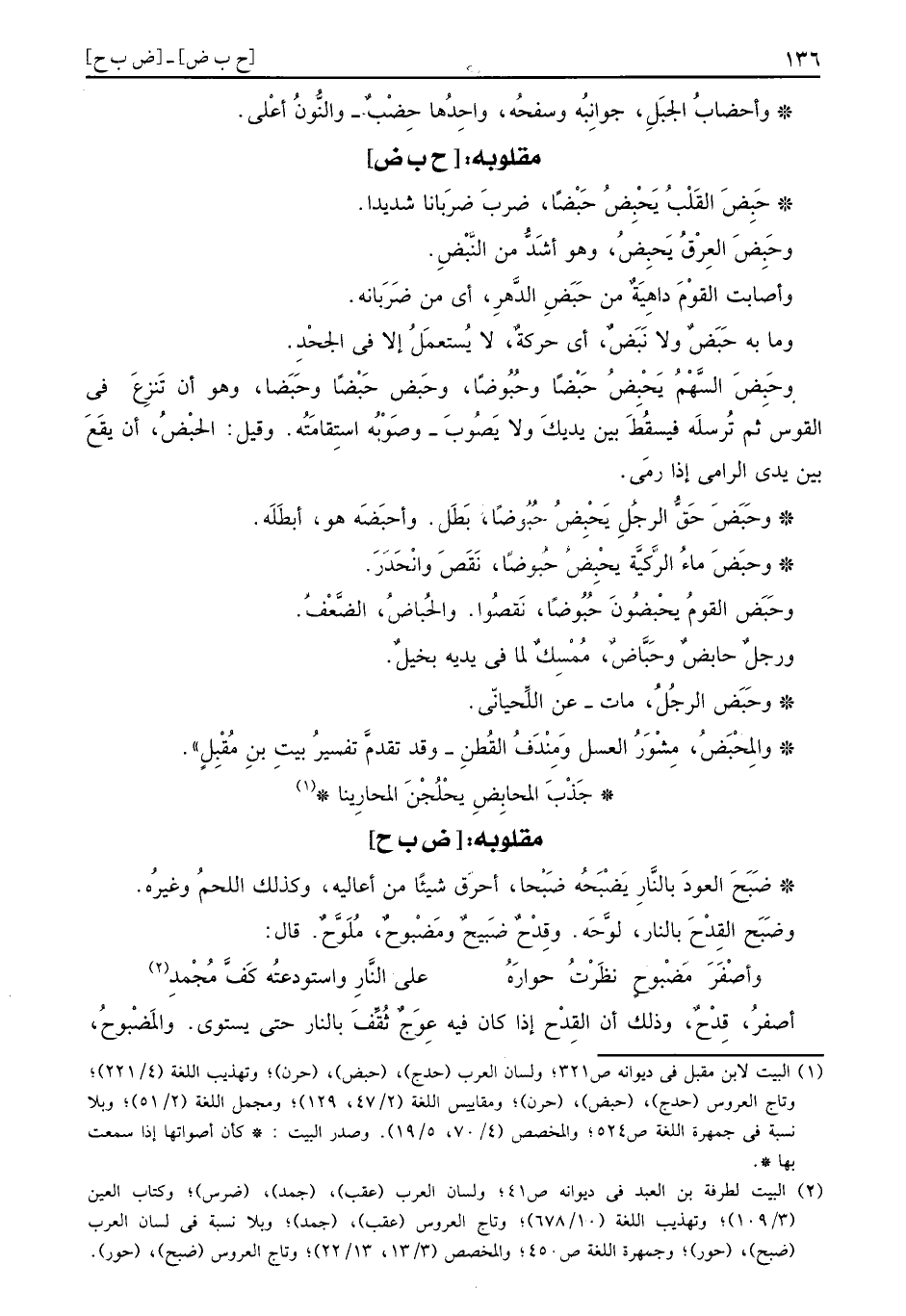 حَبِضَ الْقلب يَحْبِضُ حَبْضاً: ضرب ضربانا شَدِيدا.