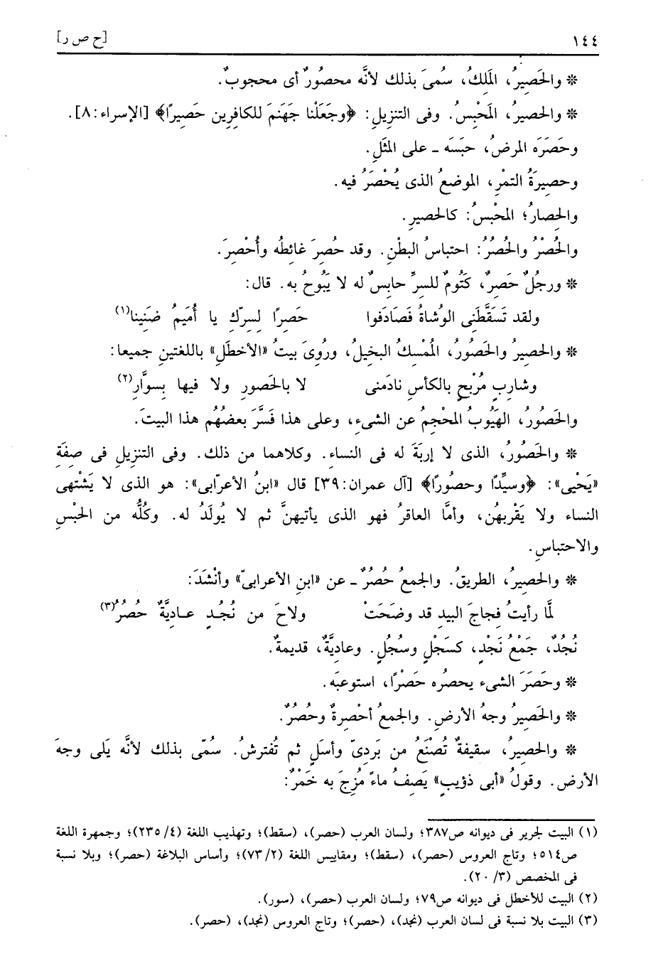 والحَصُورُ، الَّذِي لَا إربة لَهُ فِي النِّسَاء. وَكِلَاهُمَا من ذَلِك. وَفِي التَّنْزِيل فِي صفة يحيى: (وسيِّداً وحصُورا) قَالَ ابْن الْأَعرَابِي: هُوَ الَّذِي لَا يَشْتَهِي النِّسَاء وَلَا يقربهن، وَأما العاقر فَهُوَ الَّذِي يأتيهن ثمَّ لَا يُولد لَهُ.