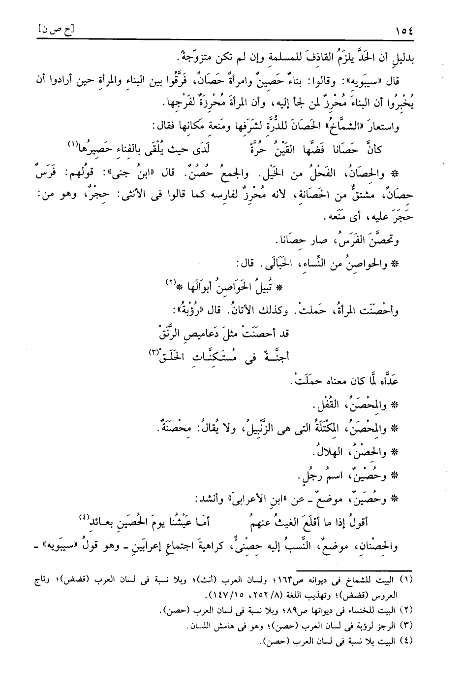 بِدَلِيل أَن الْحَد يلْزم الْقَاذِف للمسلمة وَإِن لم تكن متزوجة. قَالَ سِيبَوَيْهٍ: وَقَالُوا: بِنَاء حَصِينٌ وَامْرَأَة حَصَانٌ، فرَّقوا بَين الْبناء وَالْمَرْأَة حِين أَرَادوا أَن يخبروا أَن الْبناء مُحرز لمن لَجأ إِلَيْهِ، وَأَن الْمَرْأَة محرزة لفرجها.