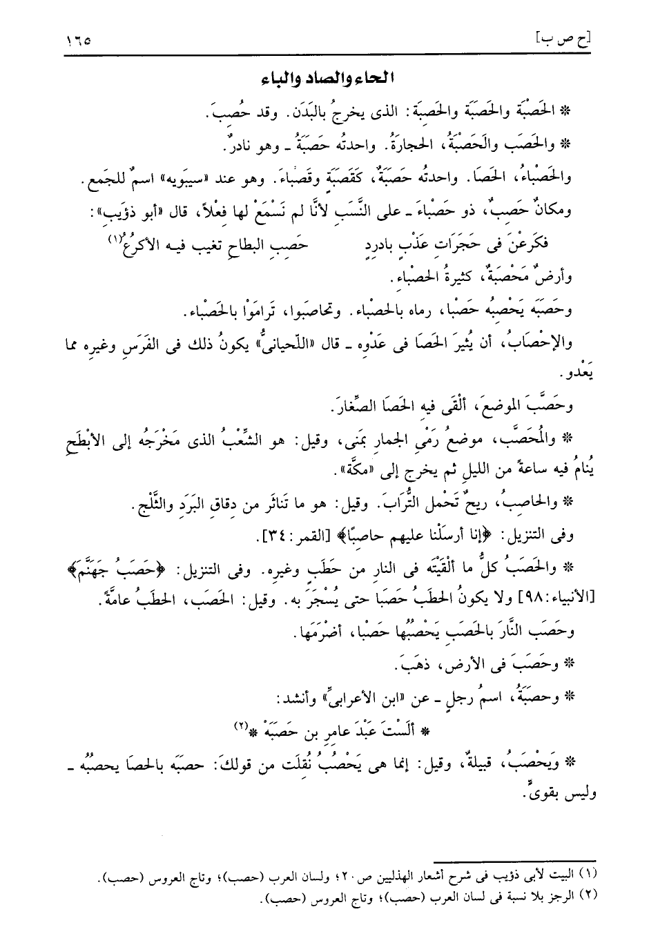 وَمَكَان حَصِبٌ، ذُو حَصْباءَ، على النّسَب لأَنا لم نسْمع لَهَا فعلا، قَالَ أَبُو ذُؤَيْب: