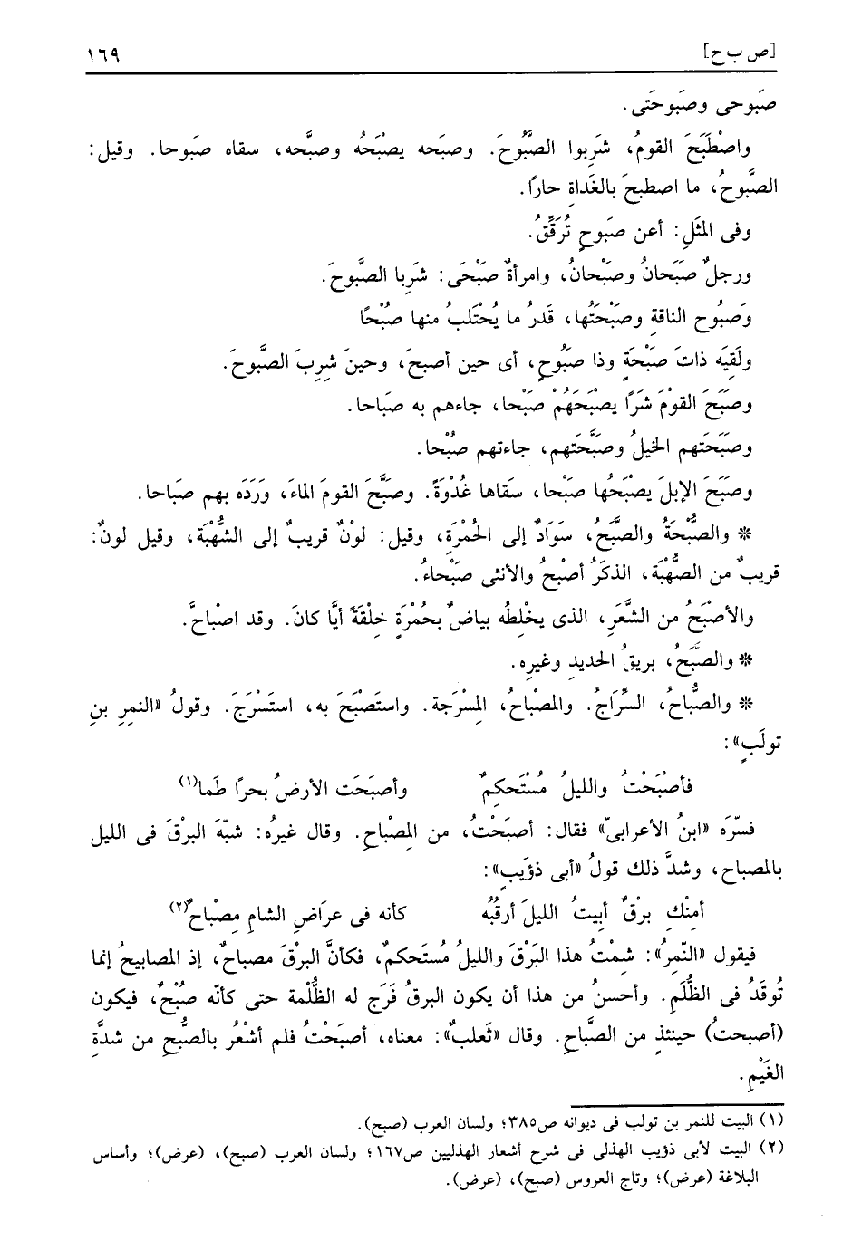 والصُّباحُ: السِّرَاجُ. والمصْباحُ، المسرجة. واستَصْبَحَ بِهِ، استسرج. وَقَول النمر بن تولب: