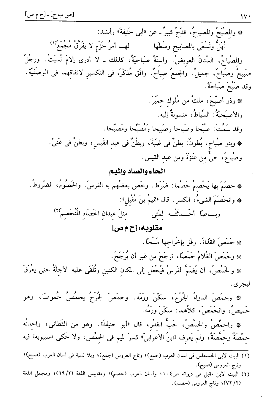 والمِصْباحُ: السنان العريض. وأسنة صَباحيّةٌ، كَذَلِك، لَا أَدْرِي إلام نسبت وَرجل صَبيحٌ وصُباحٌ، جميل. وَالْجمع صِباحٌ. وَافق مذكره فِي التكسير لاتِّفَاقهمَا فِي الوصفية. وَقد صَبُحَ صَباحَهً.