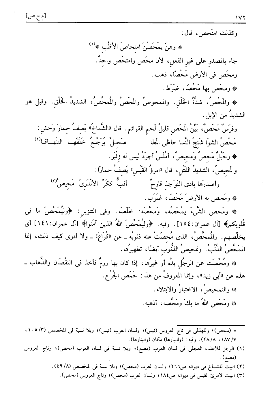 والمَحِيصُ: الشَّديد الفتل، قَالَ امْرُؤ الْقَيْس يصف حمارا: