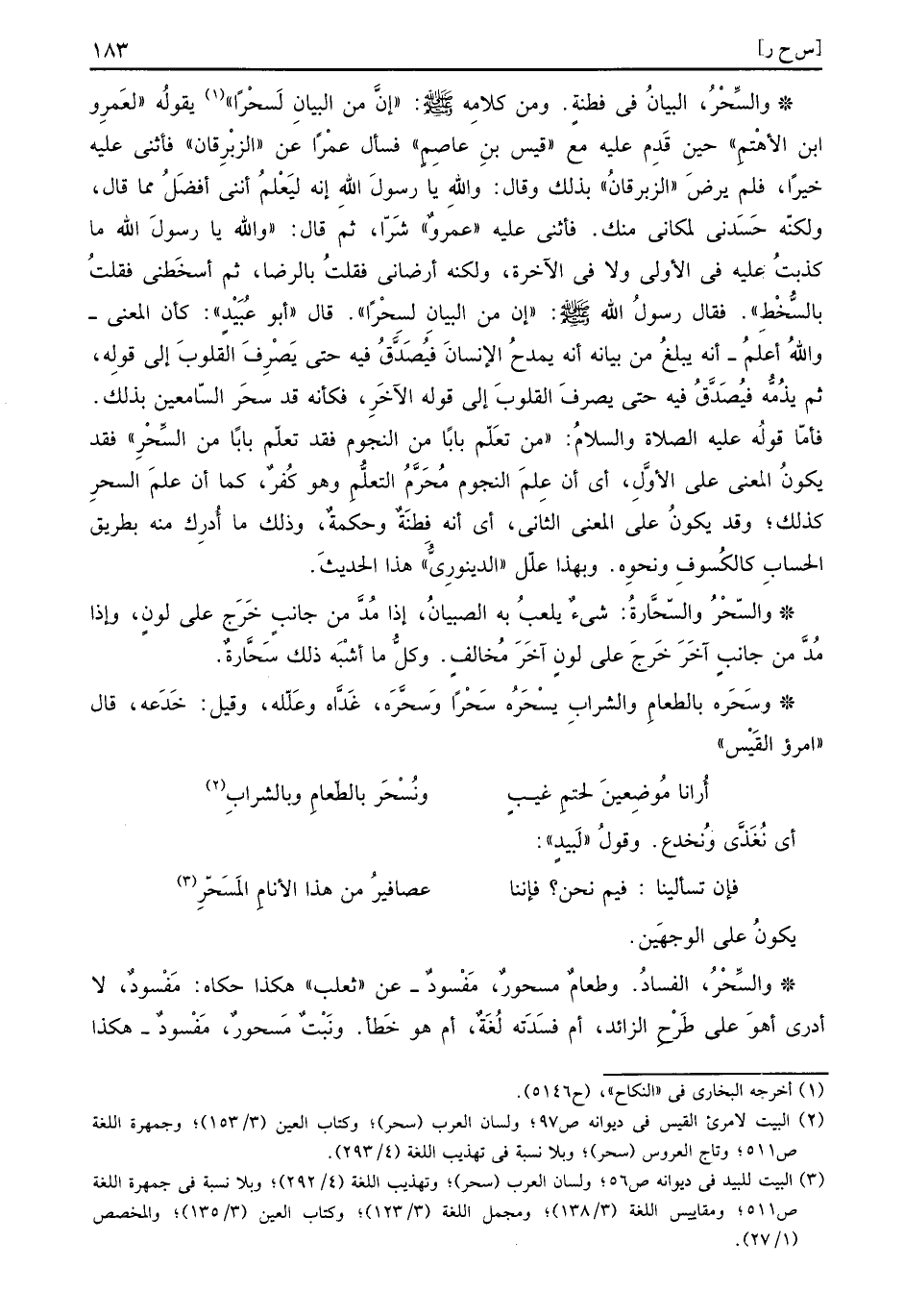 والسِّحْرُ: الْبَيَان فِي فطنة. وَمن كَلَامه صَلَّى اللهُ عَلَيْهِ وَسَلَّمَ: " إِن من الْبَيَان لَسحْراً " يَقُوله لعَمْرو بن الْأَهْتَم حِين قدم عَلَيْهِ مَعَ قيس ابْن عَاصِم فَسَأَلَ عمرا عَن الزبْرِقَان فَأثْنى عَلَيْهِ خيرا، فَلم يرض الزبْرِقَان بذلك وَقَالَ: وَالله يَا رَسُول الله إِنَّه ليعلم إِنَّنِي أفضل مِمَّا قَالَ، وَلكنه حسدني لمكاني مِنْك. فَأثْنى عَلَيْهِ عَمْرو شرا، ثمَّ قَالَ: " وَالله يَا رَسُول الله مَا كذبت عَلَيْهِ فِي الأولى وَلَا فِي الْآخِرَة، وَلكنه أرضاني فَقلت بِالرِّضَا، ثمَّ أسخطني فَقلت بالسخط ". فَقَالَ رَسُول الله صَلَّى اللهُ عَلَيْهِ وَسَلَّمَ: " إِن من الْبَيَان لسحراً ".