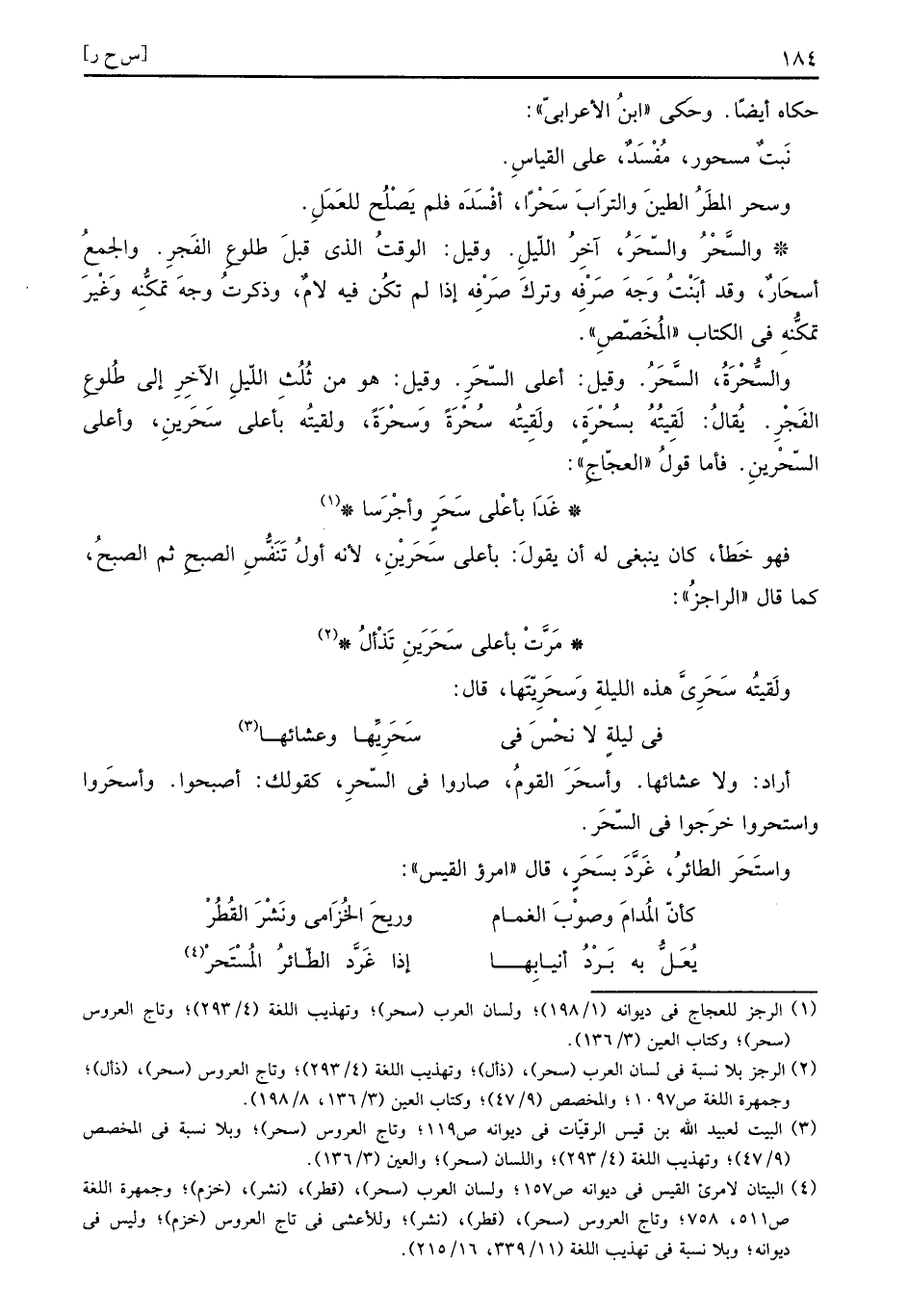 والسُّحْرَةُ والسَّحَرُ. وَقيل: أَعلَى السّحَرِ. وَقيل: هُوَ من ثلث اللَّيْل الآخر إِلَى طُلُوع الْفجْر. يُقَال: لَقيته بسُحْرَةٍ، ولقيته سُحْرَةً وسَحْرَةً، ولقيته بِأَعْلَى سَحَرينِ، وَأَعْلَى السّحْرينِ. فَأَما قَول العجاج: