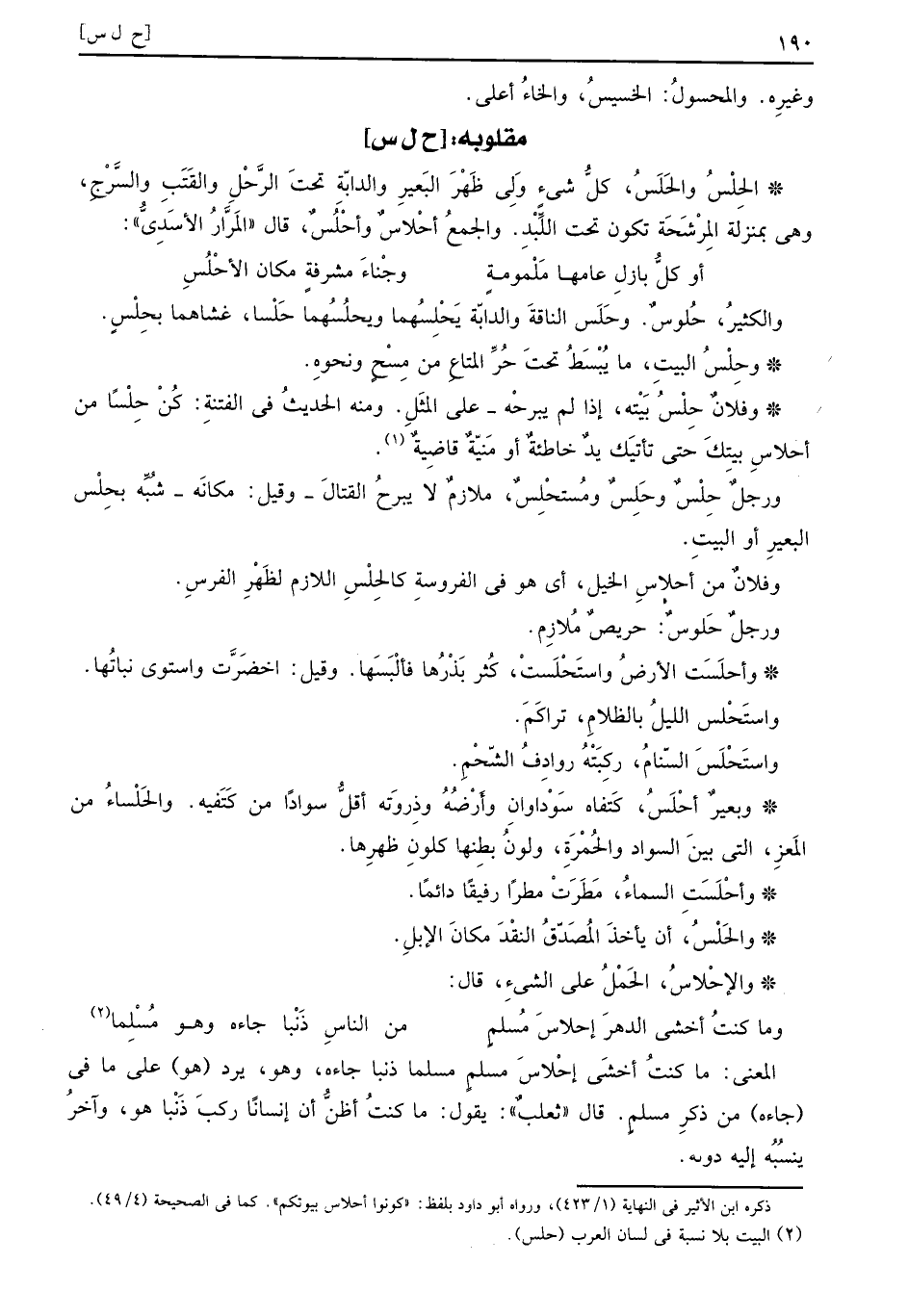 وبعير أحْلَسُ: كتفاه سوداوان وأرضه وذروته أقل سوادا من كَتفيهِ. والحَلْساءُ من الْمعز: الَّتِي بَين السوَاد والحمرة، ولون بَطنهَا كلون ظهرهَا.