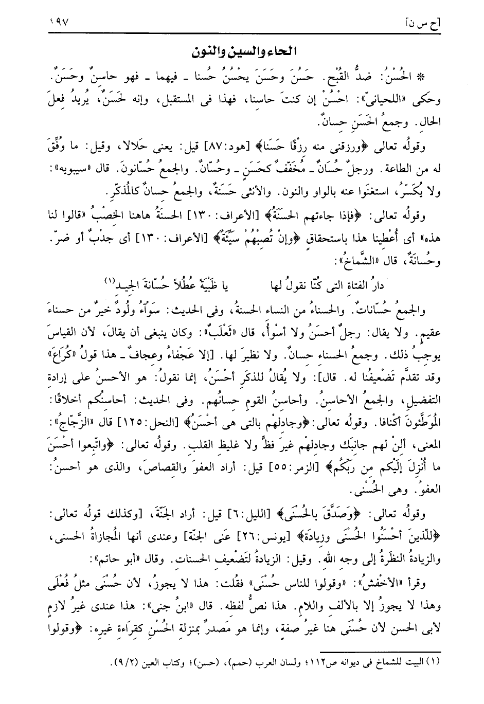 وَالْجمع حُسّاناتٌ. والحسناءُ من النِّسَاء الحسنةُ، وَفِي الحَدِيث: " سَوْاءُ ولُودٌ خيرُ من حسناءَ عقيمٍ " وَلَا يُقَال: رجل أحسَنُ وَلَا أَسْوَأ، قَالَ ثَعْلَب: وَكَانَ يَنْبَغِي أَن يُقَال، لِأَن الْقيَاس يُوجب ذَلِك. وَجمع الحسناءِ حِسانٌ. وَلَا نَظِير لَهَا. إِلَّا عجفاء وعجاف، هَذَا قَول كرَاع وَقد تقدم تضعيفنا لَهُ. قَالَ: وَلَا يُقَال للذّكر أحْسَنُ، إِنَّمَا نقُول: هُوَ الْأَحْسَن على إِرَادَة التَّفْضِيل، وَالْجمع الأحاسِنُ. وأحاسِنُ الْقَوْم حِسانُهم. وَفِي الحَدِيث: " أحاسِنُكم أَخْلَاقًا: الموطئون أكنافا ". وَقَوله تَعَالَى: (وجادِلْهم بِالَّتِي هِيَ أحْسَنُ) قَالَ الزّجاج: الْمَعْنى، ألن لَهُم جَانِبك وجادلهم غير فظ وَلَا غليظ الْقلب. وَقَوله تَعَالَى: (واتّبِعوا أحْسَنَ مَا أُنْزِلَ إلَيْكم مِن رَبِّكُم) قيل: أَرَادَ الْعَفو وَالْقصاص، وَالَّذِي أحسنُ: الْعَفو. وَهِي الحُسنى. وَقَوله تَعَالَى: (وصَدَّقَ بالحُسْنَى) قيل: أَرَادَ الْجنَّة، وَكَذَلِكَ قَوْله تَعَالَى: (للّذينَ أحْسَنُوا الحُسْنَى وزِيادَة) عَنى الْجنَّة، وَعِنْدِي إِنَّهَا المجازاة الْحسنى، وَالزِّيَادَة النظرة إِلَى وَجه الله. وَقيل: الزِّيَادَة لتضعيف الْحَسَنَات. وَقَالَ أَبُو حَاتِم: