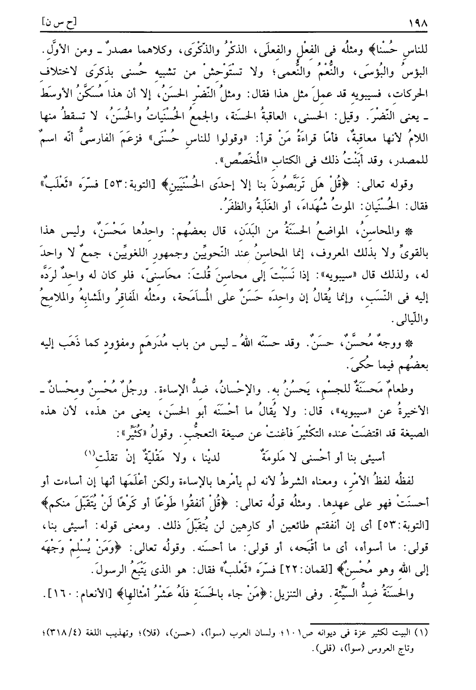 للناسِ حُسْنا) وَمثله فِي الْفِعْل والفعلى، الذّكر والذكرى، وَكِلَاهُمَا مصدر، وَمن الأول. الْبُؤْس والبؤسى، وَالنعَم والنعمى، وَلَا تستوحش من تَشْبِيه حُسنى بذكرى لاخْتِلَاف الحركات، فسيبويه قد عمل مثل هَذَا فَقَالَ: وَمثل النّظر الحسَنُ، إِلَّا أَن هَذَا مسكن الْأَوْسَط، يَعْنِي النَّضر. وَقيل: الْحسنى، الْعَاقِبَة الحسَنة، وَالْجمع الحُسْنَياتُ والحُسَنُ، لَا تسْقط مِنْهَا اللَّام لِأَنَّهَا معاقبة، فَأَما قِرَاءَة من قَرَأَ: (وقُولُوا للناسِ حُسْنَى) فَزعم الْفَارِسِي انه اسْم للمصدر، وَقد أبنت ذَلِك فِي الْكتاب الْمُخَصّص.