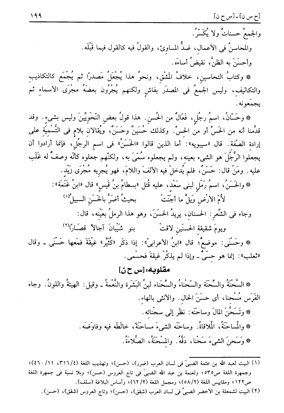 وحَسّانٌ: اسْم رجل، فعال من الحُسنِ. هَذَا قَول بعض النَّحْوِيين وَلَيْسَ بِشَيْء. وَقد قدمنَا انه من الحَسّ أَو من الحسّ. وَكَذَلِكَ حُسَينٌ وحَسَنٌ، ويقالان بلام فِي التَّسْمِيَة على إِرَادَة الصّفة. قَالَ سِيبَوَيْهٍ: أما الَّذين قَالُوا الحَسَنُ فِي اسْم الرجل، فَإِنَّمَا أَرَادوا أَن يجْعَلُوا الرجل هُوَ الشَّيْء بِعَيْنِه، وَلم يَجْعَلُوهُ سمي بِهِ، وَلَكنهُمْ جَعَلُوهُ كَأَنَّهُ وصف لَهُ غلب عَلَيْهِ. وَمن قَالَ: حَسَنٌ، فَلم يدْخل فِيهِ الْألف وَاللَّام، فَهُوَ يجريه مجْرى زيد.