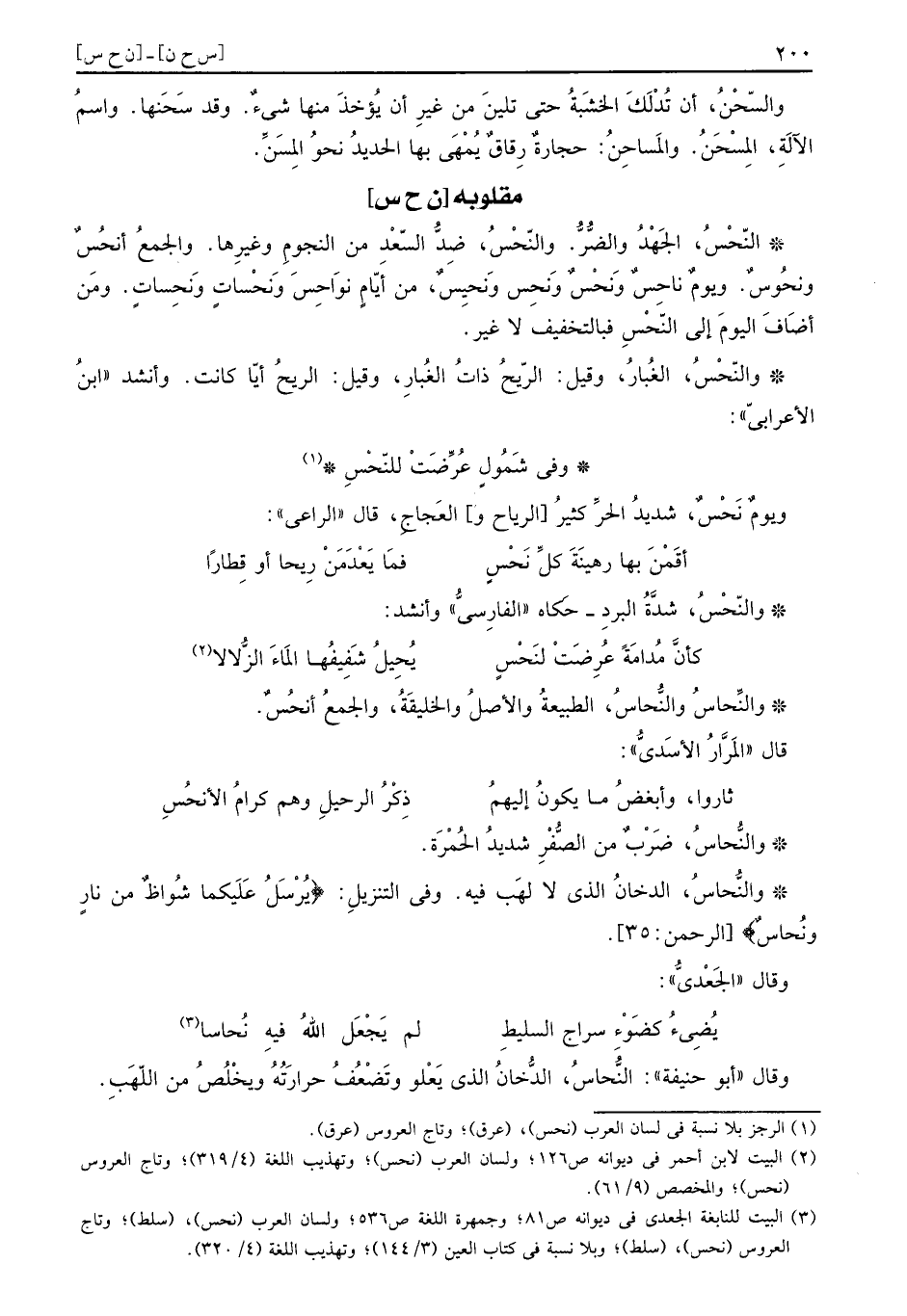 والنِّحاسُ والنُّحاسُ: الطبيعة وَالْأَصْل والخليقة، وَالْجمع أنحُسٌ، قَالَ المرار الاسدي: