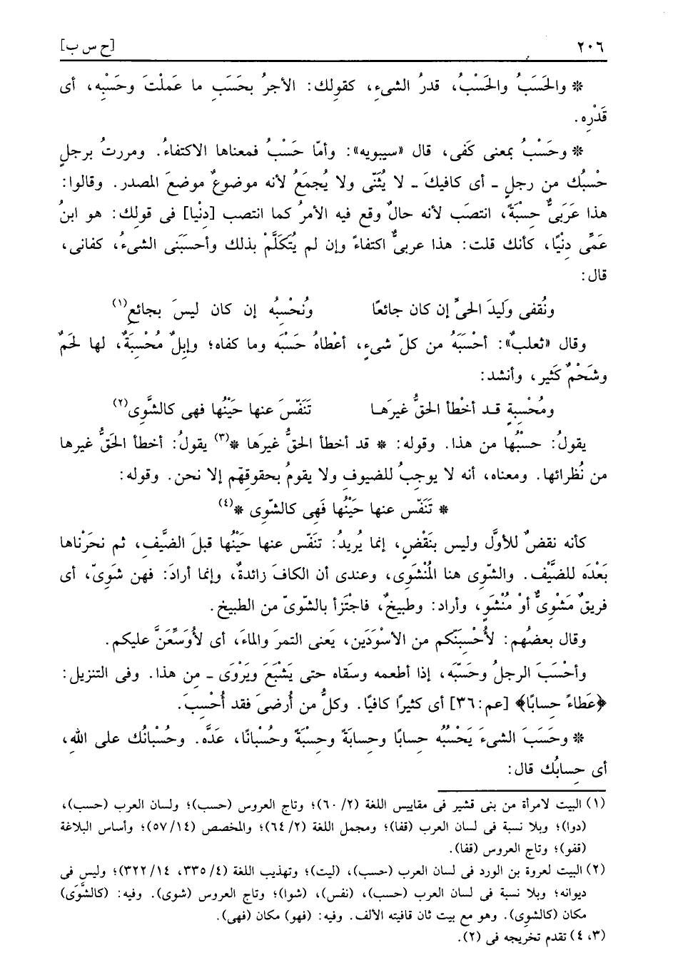 وحَسْبُ بِمَعْنى كفى، قَالَ سِيبَوَيْهٍ: وَأما حَسْبُ فمعناها الِاكْتِفَاء. ومررت بِرَجُل حسْبُك من رجل، أَي كافيك، لَا يثنى وَلَا يجمع لِأَنَّهُ مَوْضُوع مَوضِع الْمصدر. وَقَالُوا: هَذَا عَرَبِيّ حِسْبَةً، انتصب لِأَنَّهُ حَال وَقع فِيهِ الْأَمر كَمَا انتصب دنيا فِي قَوْلك: هُوَ ابْن عمي دنيا، كَأَنَّك قلت: هَذَا عَرَبِيّ اكْتِفَاء وَإِن لم يتَكَلَّم بذلك. وأحسَبَني الشَّيْء: كفاني، قَالَ: