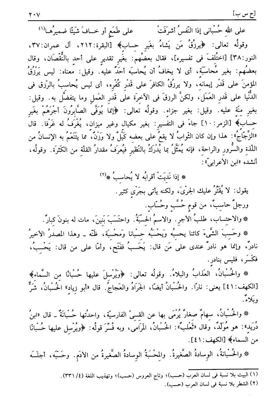 والحُسْبانُ: الْعَذَاب وَالْبَلَاء. وَقَوله تَعَالَى: (ويُرْسِلَ عَلَيْهَا حُسْبانا مِن السَّماءِ) يَعْنِي: نَارا. والحُسْبانُ أَيْضا، الْجَرَاد والعجاج. قَالَ أَبُو زِيَاد الحُسْبانُ، شَرّ وبلاء.