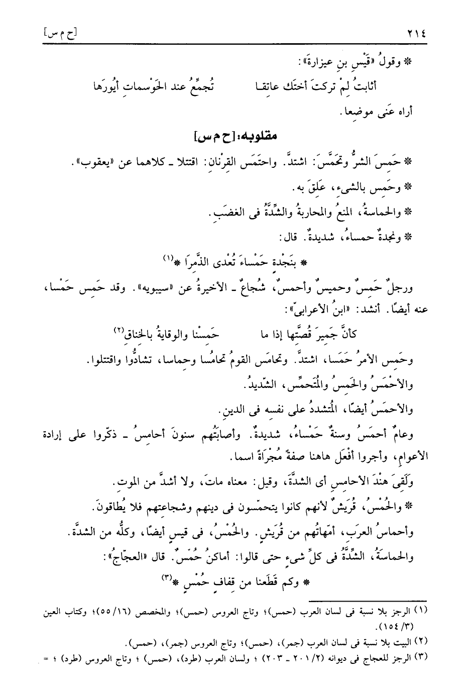 وَرجل حَمِسٌ وحميسٌ وأحمسٌ، شُجَاع، الْأَخِيرَة عَن سِيبَوَيْهٍ. وَقد حَمِس حَمْسا، عَنهُ أَيْضا. أنْشد ابْن الْأَعرَابِي: