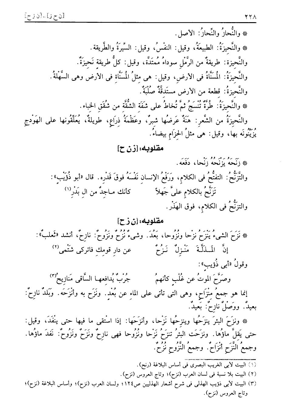نَزَحَ الشَّيْء يَنْزَحُ نزْحا ونُزُوحا: بعد. وَشَيْء نُزُحٌ ونَزُوحٌ: نازِحٌ، أنْشد ثَعْلَب: