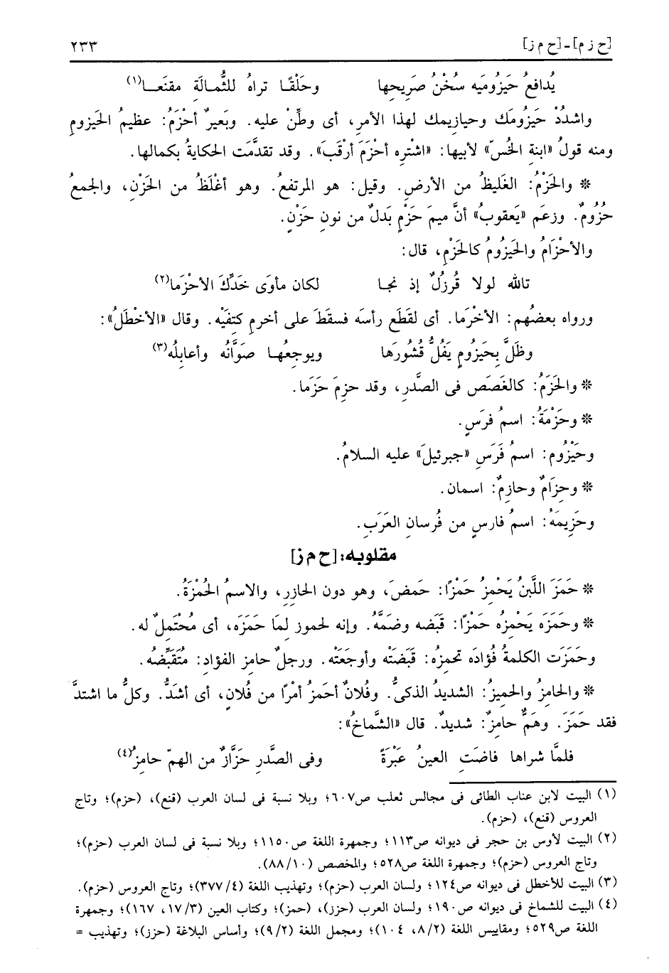 وَاشْدُدْ حَيزُومَك وحيازِيمكَ لهَذَا الْأَمر، أَي وَطن عَلَيْهِ. وبعير أحْزَمُ: عَظِيم الحَيزومِ وَمِنْه قَول ابْنة الخس لأَبِيهَا: " اشتره أحْزَمَ أرْقَبَ ". وَقد تقدّمت الْحِكَايَة بكمالها.