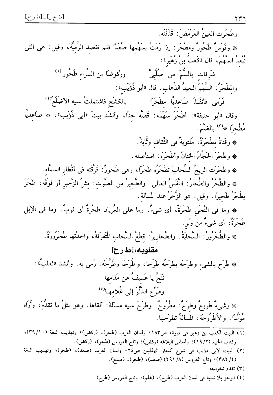 وَقَالَ أَبُو حنيفَة: أطْحَرَ سَهْمه: قصه جدا، وَأنْشد بَيت أبي ذُؤَيْب: